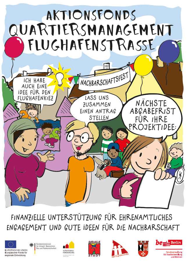 Der im Flughafenkiez ansässige Kunstverein Artistania e.V. führt wieder ein kulturelles Mitmachprojekt durch. Es werden Figuren gebastelt und zu diesen Botschaften und Geschichten ausgedacht. Das Thema im Hintergrund dabei ist die Umweltverschmutzung und die Folgen auf die Natur und die Menschheit. Die Figuren werden in vier Workshops mit Interessierten aus der Bewohnerschaft und Künstlern von Artistania e.V. gemeinsam erschaffen. Nach Abschluss des Projektes ist vorgesehen, die Figuren im Rahmen von öffentlichen Veranstaltungen vorzuführen.