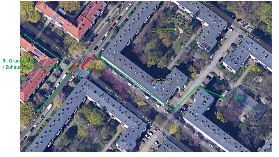 Die Kreuzung liegt in unmittelbarere Nähe einer Kita und in der Nähe der Bötzow-Grundschule. Entsprechend müssen hier junge Kinder diese Kreuzung regelmäßig (diagonal) queren (hellblaue Markierung).