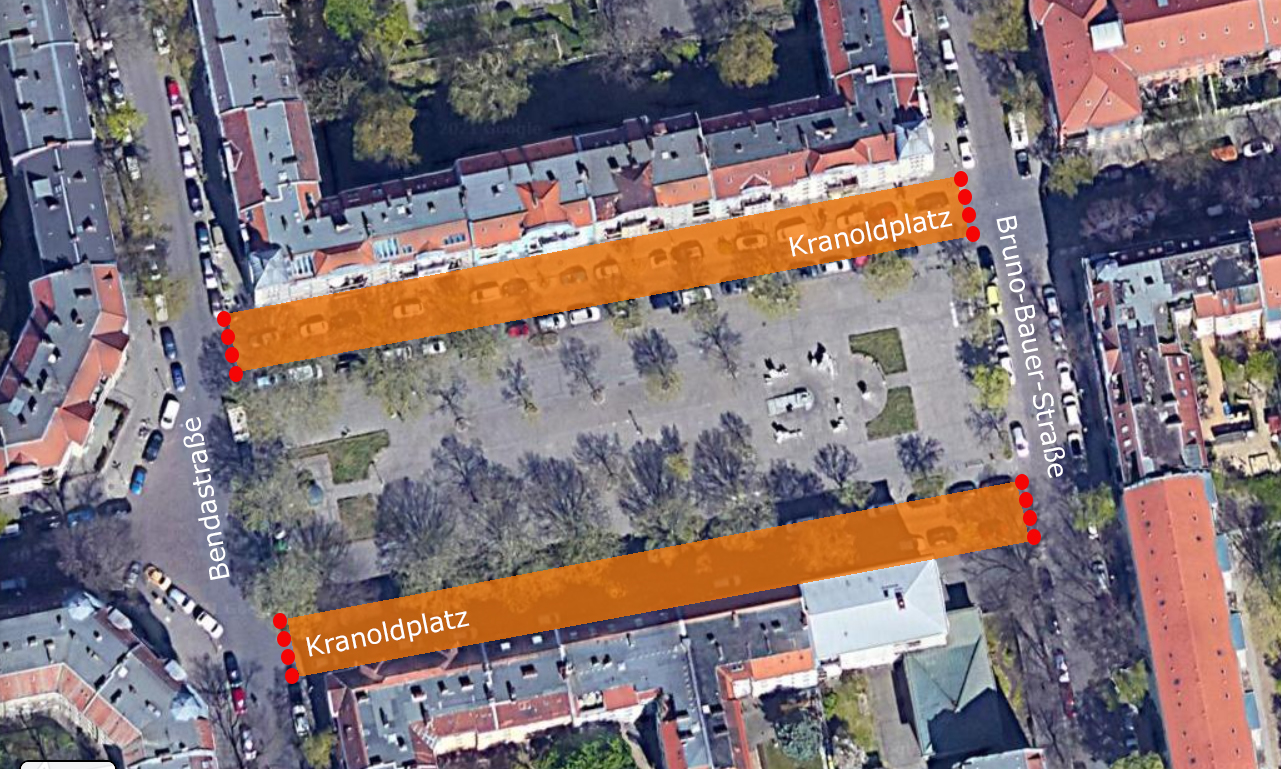 Der Kranoldplatz ist ein wichtiger Punkt im Neuköllner Ortsteil, der nach Britz überleitet. Samstags findet hier ein Markt statt, sonntags regelmäßig ein Flohmarkt. Insbesondere in Zeiten von Corona hat sich herausgestellt, wie wichtig öffentliche Plätze mit Aufenthaltsqualität sind. Leider ist der Kranoldplatz von vier Straßen umgeben. Zwei davon (Bruno-Bauer und Bendastraße) sind stark befahren. Die beiden anderen werden hauptsächlich zum Parken genutzt, stellen aber auch die Verbindung der beiden anderen Straßen her. So ist der Platz stark von Autos bestimmt. Mein Vorschlag ist, den Platz (ähnlich dem Böhmischen Platz in Rixdorf) zu beruhigen, indem die beiden "Parkstraßen" (Kranoldplatz) für den Autoverkehr geschlossen werden. Der Platz erhält eine Erweiterung, die angrenzenden Bürgersteige und die Straße werden Teil des Platzes. Hier böte sich auch die Gelegenheit die Versiegelung der Straße aufzubrechen und so den dringend benötigten Wasserbedarf der umstehenden Bäume zu regulieren. Eine Zonierung des Platzes in kleinteiligere und große Flächen wäre über die Erweiterung möglich: Die derzeitige Straßenfläche könnte auf der Seite der Wasserpumpe für "Urban gardening" inform von Hochbeeten verwendet werden. Die gegenüberliegende jetzige Straßenfläche in eine Skate- und Rollerblade-Fläche umgewandelt werden. Der erste wichtige Schritt für die Umgestaltung des Platzes ist die Sperrung dieser beiden Straßen, die beide Kranoldplatz heißen. Die weitere Entwicklung des Platzes kann phasenweise erfolgen. Hierfür ist zunächst die Sperrung durch Poller auf allen vier Eingängen notwendig. Die Angleichung der Bodenflächen ist dann der nächste Schritt. Die Ausgestaltung der Bodenflächen anhand eines Entwicklungsplans (Entsiegelung, Aufenthalstqualität) zur Flächennutzung ist notwendig. In der nächsten Phase mögliche Einbauten, die benötigt werden. Dies könnte beispielsweise ein Schuppen für Geräte und Gießkannen für Hochbeete sein. Die Aufenthaltsqualität auf dem Platz würde sich deutlich erhöhen, wenn das Verkehrsaufkommen reduziert würde. Auch die Gefahr für kleinere Kinder ließe sich hierdurch maßgeblich reduzieren. Die Sicherheit des gesamten Karrees würde deutlich erhöht, da auch das Verkehrsaufkommen der beiden größeren Straßen hierdurch verrigert wird. Es liegen unmittelbar drei Kindergärten und ein Hospiz am Platz an.