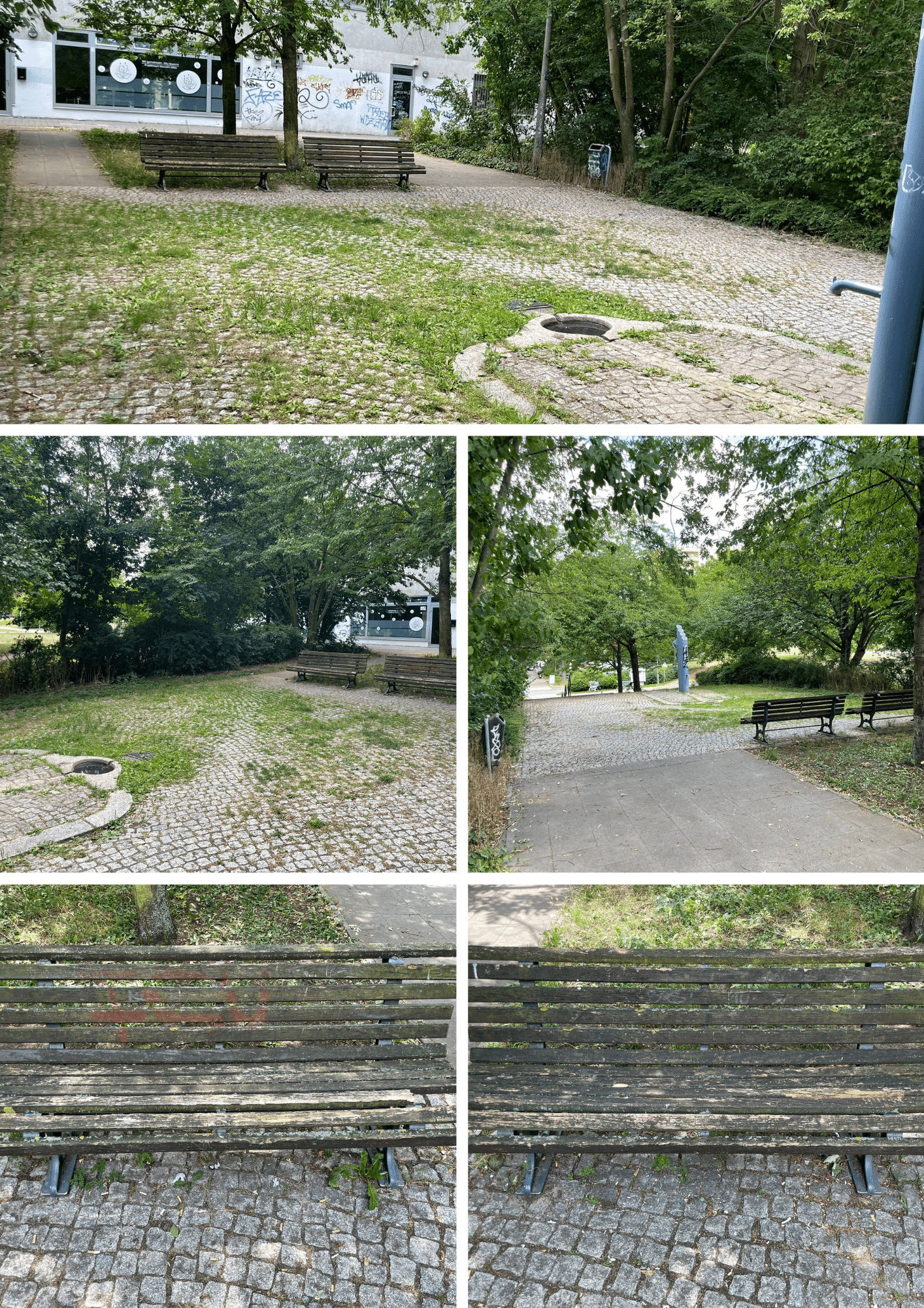 Wucherndes Unkraut auf dem Mosaikpflaster, Graffiti auf dem Brunnen und morsche und verrottende Sitzbalken auf den zwei Parkbänken wirken leider auf die Nachbarschaft abschreckend (siehe beigefügte Bilder).