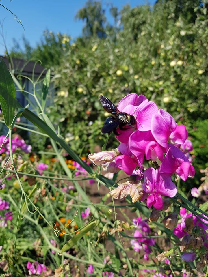 Neben den Menschen fühlen sich auch bedrohte Tierarten sichtlich wohl bei uns: Nachts kommen die Fledermäuse aus den Kästen, die wir für sie aufgebaut haben. Nashornkäfer und Rosenkäfer krabbeln über Blätter. Igel finden Platz in eigenes errichteten Totholzhecken. Knoblauchkröte und Kammmolch leben im Pfuhl, der gerade mit Unterstützung der Stiftung Naturschutz und anderer Förderer renaturiert wird. Die vom Aussterben bedrohte Blaue Holzbiene kreist um den Lavendel. Unsere Kinder zählen Insekten und melden sie an Naturschutzvereine. Damit es noch mehr werden können, pflanzen wir bienenfreundliche Gewächse und siedeln seltene regionale Wildpflanzen an. Damit wir in Zukunft verlässliche Daten über den Bestand unserer Fauna und Flora zur Verfügung stehen, haben wir uns dem ArtenFinder-Programm angeschlossen und Wildtierkameras installiert.
