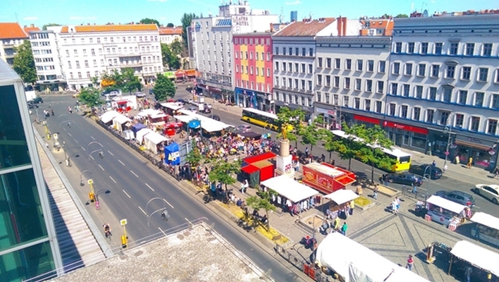 Der Hermannplatz sollte auf jeden Fall als hochfrequentierter Stadtplatz erhalten, besser noch entwickelt werden. Hier treffen sich nicht nur die Bezirke Kreuzberg und Neukölln. Auf dem Platz findet seit vielen Jahren an fünf (!) Tagen ein Wochenmarkt jeweils ganztägig (Mo bis Fr. 10-18:00 Uhr) statt. Als Betreiber des Marktes haben wir mit unserer Neuköllner Marktbühne sogar die Open- Air-Livemusik etabliert. Markt und Bühne beleben den Platz, dienen Anwohnern als Treffpunkt und bieten Passanten Aufenthaltsqualität – obwohl rundherum der Verkehr tobt. Kultur und Nahversorgung, mitten in der verdichteten Stadt.
