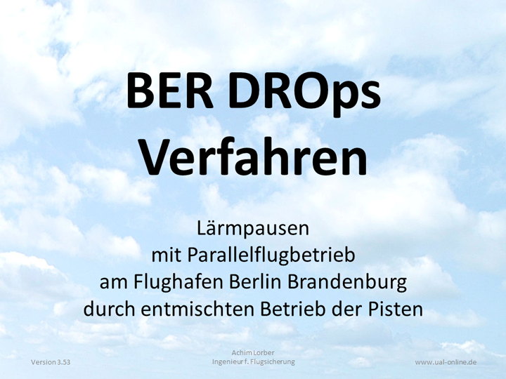 Mein Konzept "BER DROps-Verfahren" ist solch ein Betriebsverfahren, das mit entmischtem unabhängigem Betrieb der Pisten dazu beitragen soll, keinen anderen mehr als nach den Umständen unvermeidbar durch den Flugbetrieb des BER zu belästigten. Außerdem würde damit weder die Durchsatzrate der Start- und Landebahnen noch die wirtschaftliche Perspektive des Flughafens beeinträchtigt.