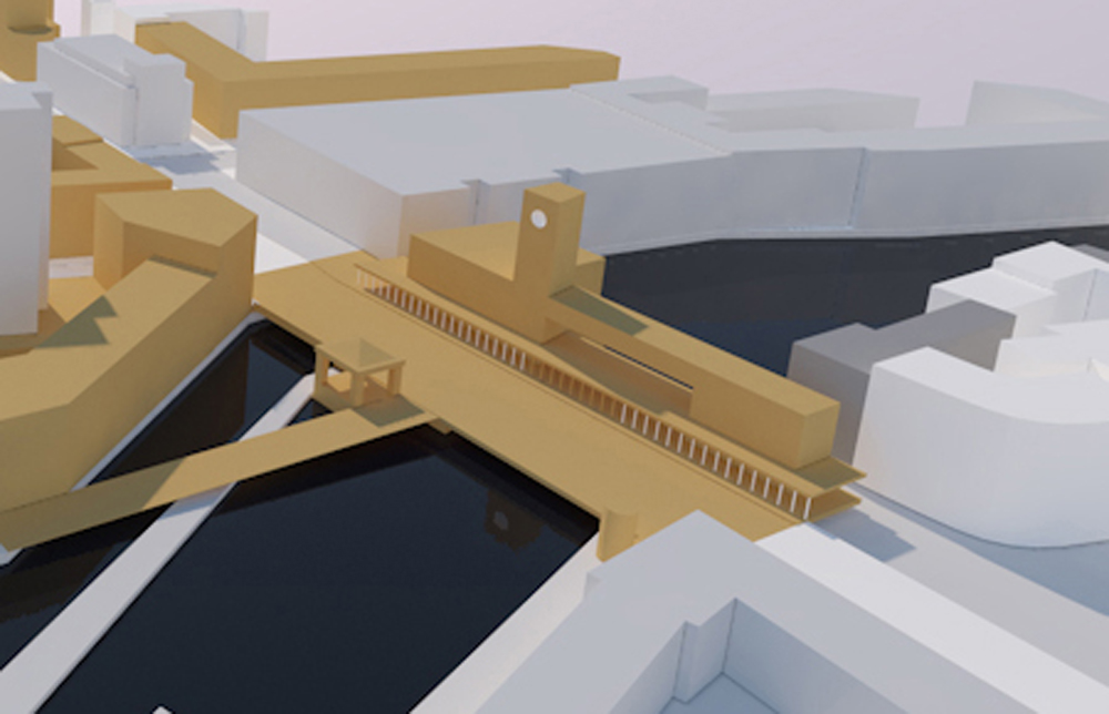 (Die Abbildung zeigt eine Entwurfsstudie, die den Mühlendamm der Vorkriegszeit modern interpretiert, links vorne die Fischerbrücke ©Lutz Mauersberger)