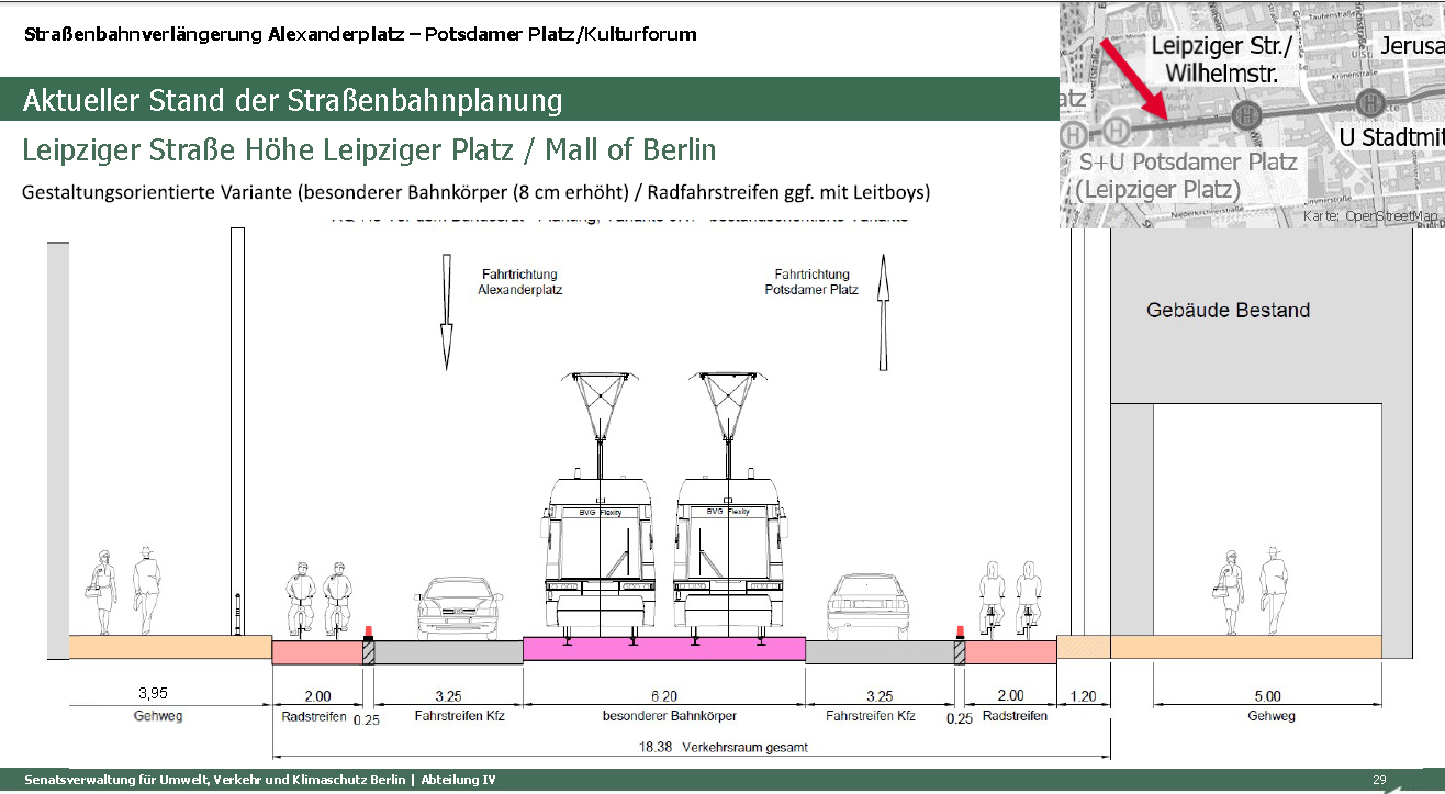 Es kann sich nur keiner vorstellen, dass so eine riesenbreite Straße plötzlich nicht mehr da ist. Dabei ist sie in der westlichen Leipziger Straße jetzt schon nur 22-23m breit, weil es zum Glück noch alte Geschäftshäuser gibt. Dieser Querschnitt sollte für alle Innenstadtstraße genügen, und die Straßenbahn paßt auch noch dazu, das wurde mit schlauen Planungen/Studien bereits bewiesen. (Abbildung zeigt das von SenUVK veröffentliche Straßenprofil der Leipziger Straße (Breite 22,33m) mit Straßenbahn!)