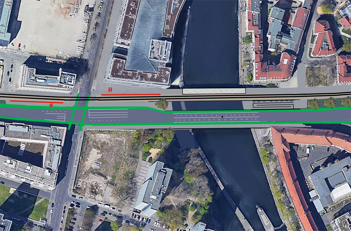 1.) Führung der Tramtrasse von Rotem Rathaus zum Spittelmarkt in Nordlage, also in beiden Fahrtrichtungen nördlich von Rad- und Autoverkehr. Das entspannt die Kreuzungssituationen, Unfallgefahren und Wartezeiten im Bereich Molkenmarkt enorm. Außerdem ließe sich die Tram dann weiter über die Alte Gertraudenbrücke führen. Die neue Getraudenbrücke müsste bei einem Neubau dann auch deutlich schmaler werden. Die Kurve bei einer Weiterführung in die Lindenstraße wäre auch weniger eng.
