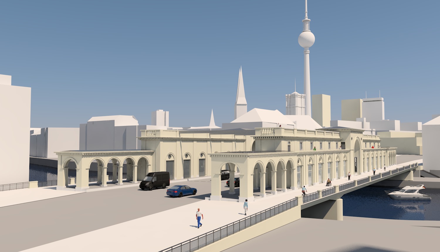 Die wiederaufgerufene Kolonnade kann in historisierender oder moderner Formensprache weitergedacht und entworfen werden. Entscheidend ist die gekonnte Kombination von statisch erforderlichem Tragwerks-Überbau mit den Wand- und Pfeiler-Stellungen der Kolonnade.