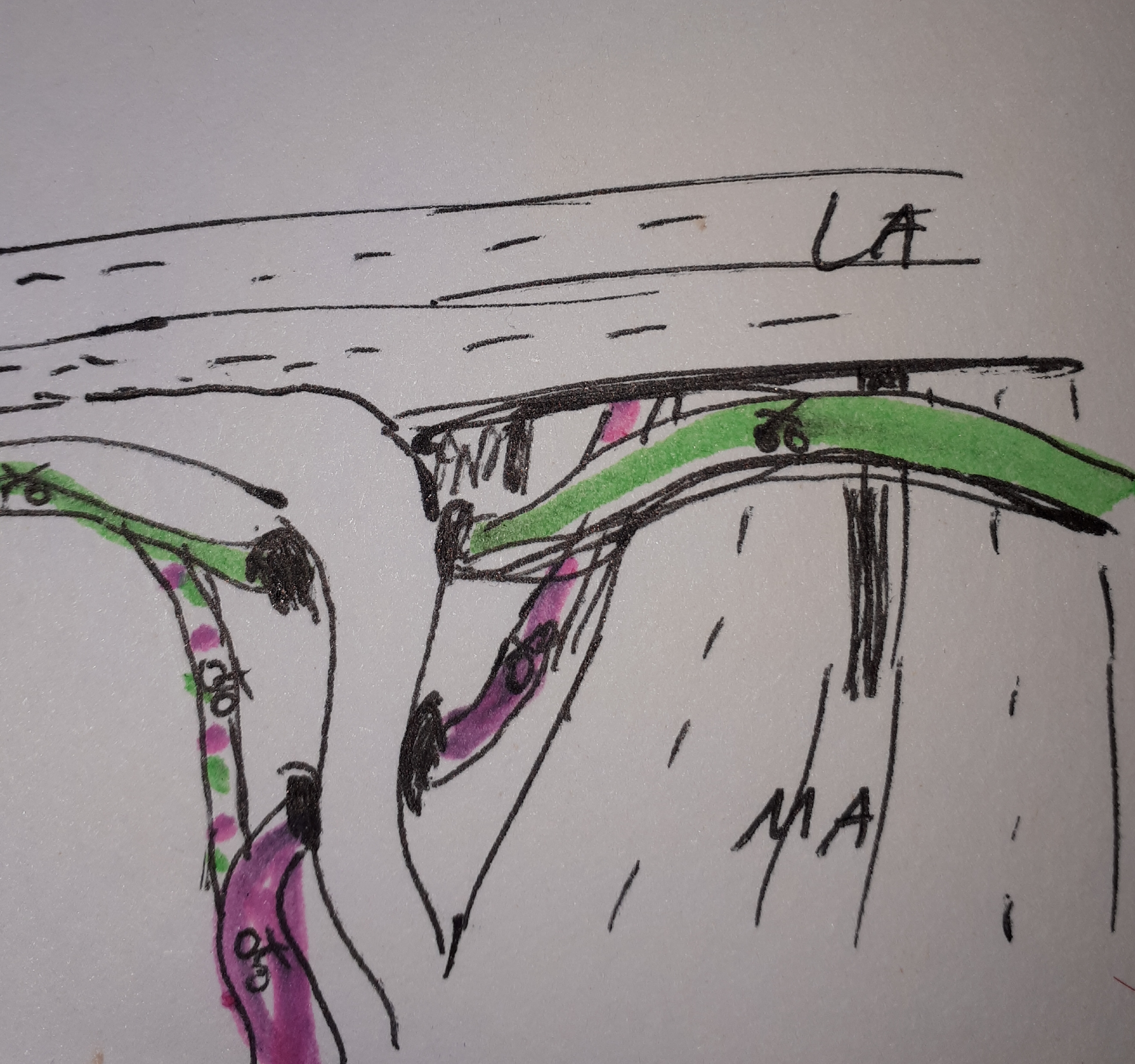 Eine eigene (Zwischen-)Ebene zwischen Märkischer Allee (MA) und Landsberger Allee (LA), wäre ideal. Die Radwege in Ost-West-Richtung könnten unterhalb der Abfahrten / Rampen zw. LA und MA und oberhalb der Fahrbahn der MA (parallel, aber getrennt von der LA) verlaufen.