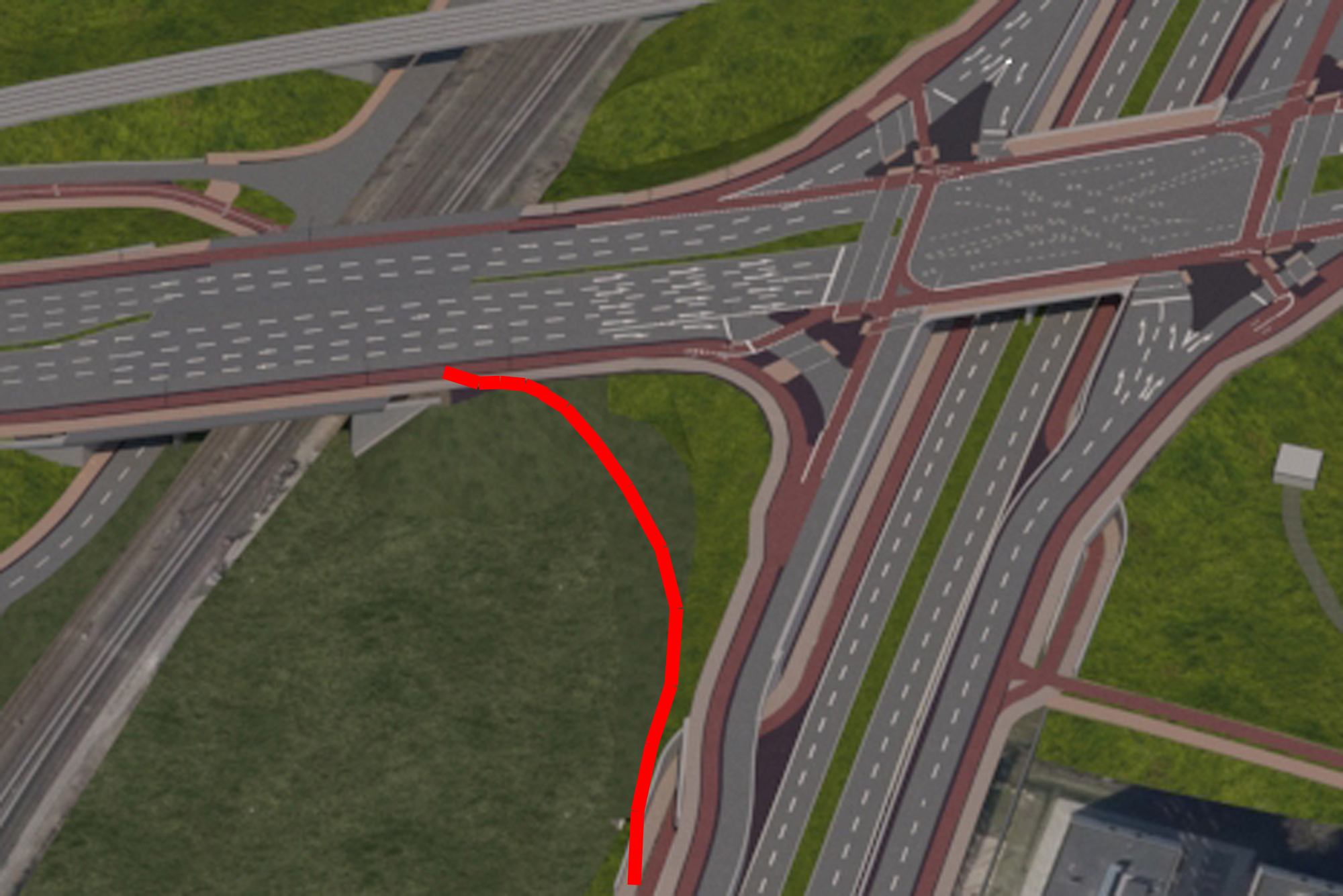 Kürzer wäre gleich nach dem Ende der Brücke rechts ausfädeln und im galanten Rechtsbogen und mit gleichmäßigen Gefälle "abzukürzen". Parallele großzüge Einfädelung am Radtunnel Südwest.