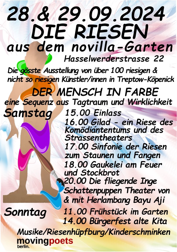 Im Sommer 2024 entstanden 17 Riesen (in menschlicher Gestalt 2.50m x1.25m) eine Kuh und ein Schwein gefertigt aus gebrauchten Holzplatten( Kleinanzeigen zuverschenken ) diese wurden von virlen in Kooperation von ca. 100 großen Künstler/innen aus Treptow Köpenick gestaltet (gekratzt gedruckt gemalt)