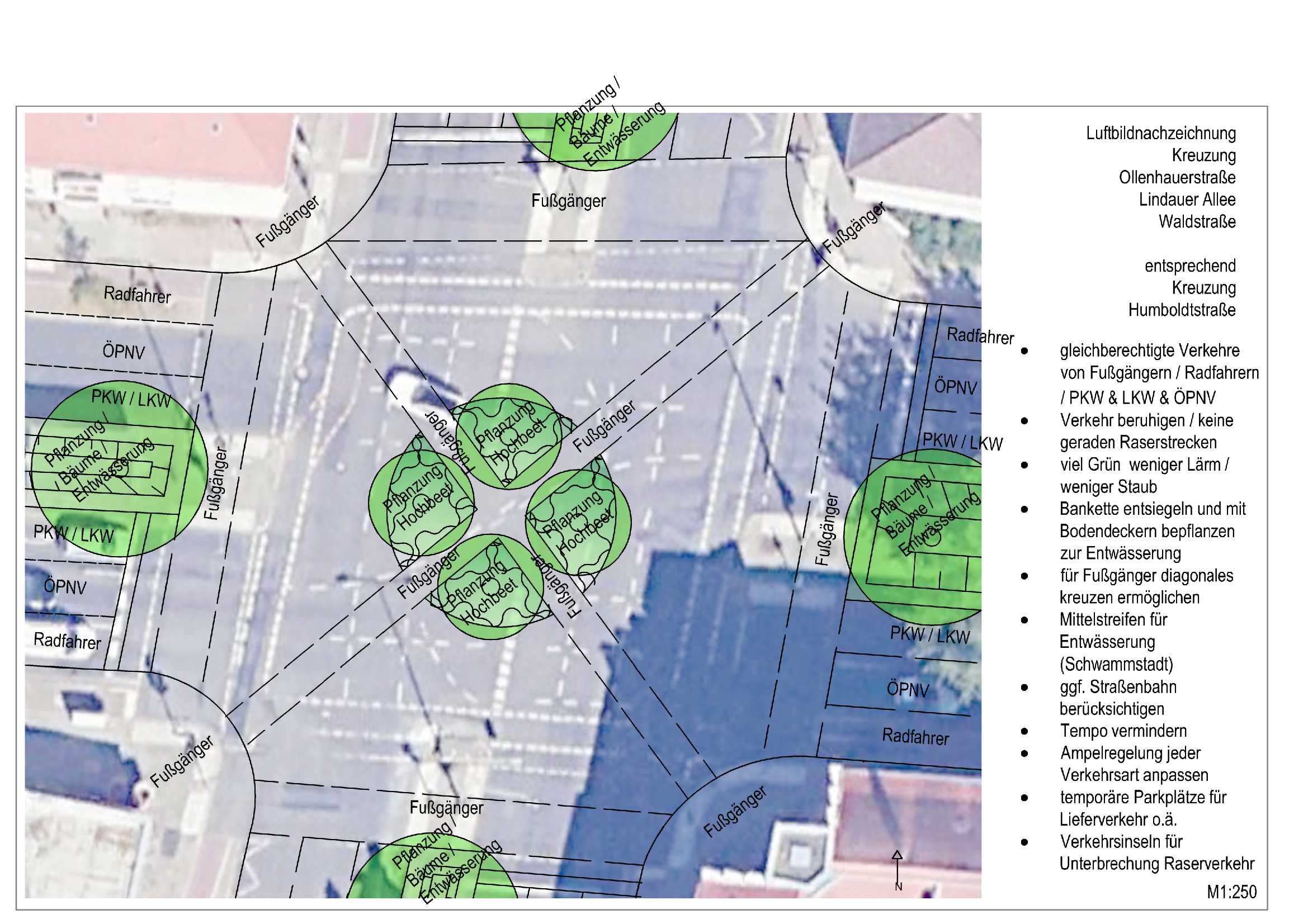 · gleichberechtigte Verkehre von Fußgängern / Radfahrern / PKW & LKW & ÖPNV · Verkehr beruhigen / keine geraden Raserstrecken· viel Grün weniger Lärm / weniger Staub / mehr Schatten / mehr Kühle · Bankette entsiegeln und mit Bodendeckern bepflanzen zur Entwässerung· für Fußgänger diagonales kreuzen ermöglichen· Mittelstreifen für Entwässerung (Schwammstadt) / Baumpflanzungen· ggf. Straßenbahn berücksichtigen· Tempo vermindern· Ampelregelung jeder Verkehrsart anpassen· temporäre Parkplätze für Lieferverkehr o.ä.· Verkehrsinseln für Unterbrechung Raserverkehr