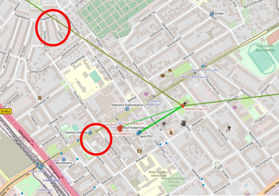 Das beiliegende Foto zeit das vorhandene Freifunk-Netz und den ungefähren Abdeckungsbereich der beiden neuen Standorte (rot eingekreist).