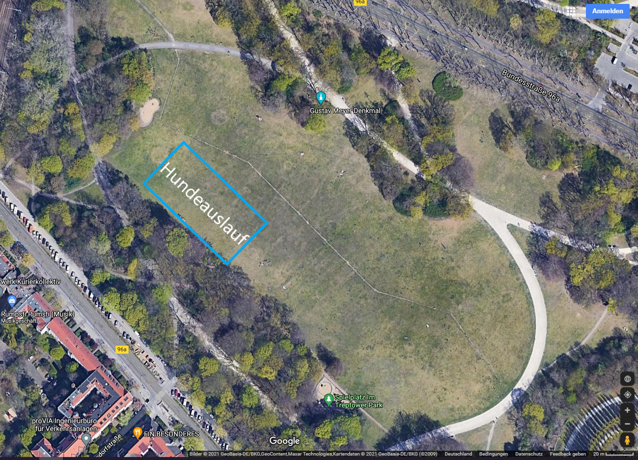 Der Hundeauslauf soll ca. 80m x 40m Grundfläche haben und könnte z.B. entlang der Randes der Wiese, mittig zwischen den zwei kleinen Spielplätzen liegen. Der Zaun sollte ca. 120cm hoch sein und es sollte 2 Tore zum Betreten der Fläche geben. Als Beispiel kann hier der Hundeauslauf auf dem Tempelhofer Feld herangezogen werden.