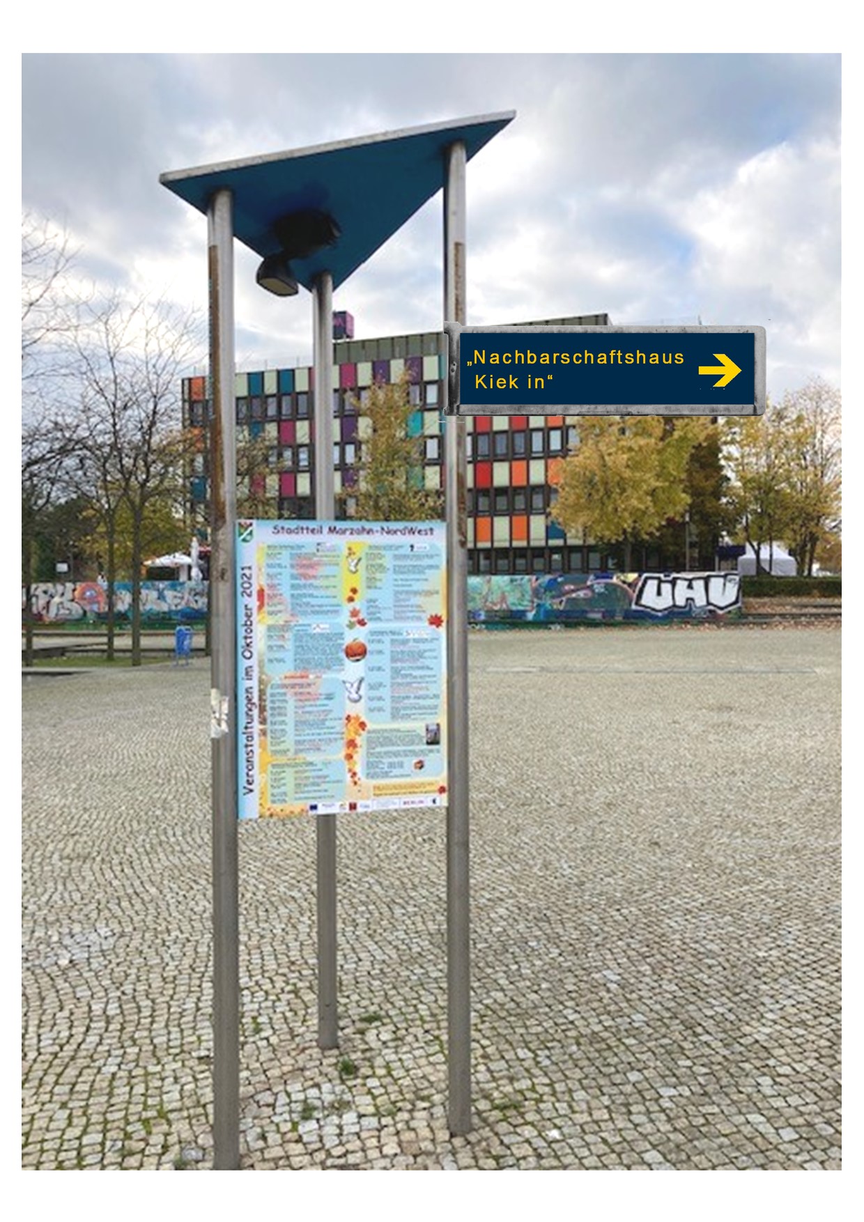 Auf Initiative und Hinweis der Bewohnerinitiative „Wir im Kiez“, die im Nachbarschaftshaus „Kiek in“ auch ein eigenes Büro als Anlaufstelle hat, ist eine bessere Auffindbarkeit des etwas versteckt liegenden Stadtteilzentrums erforderlich. Durch eine entsprechende Ausschilderung (blau-gelb mit Rahmen) entlang der Havemannstraße als Hauptstraße des Stadtteils soll insbesondere neuen Nachbarn und Ortsunkundigen der Weg zum Nachbarschaftshaus „Kiek in“ besser aufgezeigt werden, so wie das bereits auch schon für andere Stadtteilzentren im Bezirk erfolgt ist. Geplant ist, die Hinweisschilder an drei der vorhandenen Infosäulen anzubringen, an denen u.a. auch die Monatspläne zu den Veranstaltungen im Stadtteil aushängen: vor dem S-Bahnhof Ahrensfelde, an der Ecke Havemannstraße/Wörlitzer Straße sowie auf dem Barnimplatz