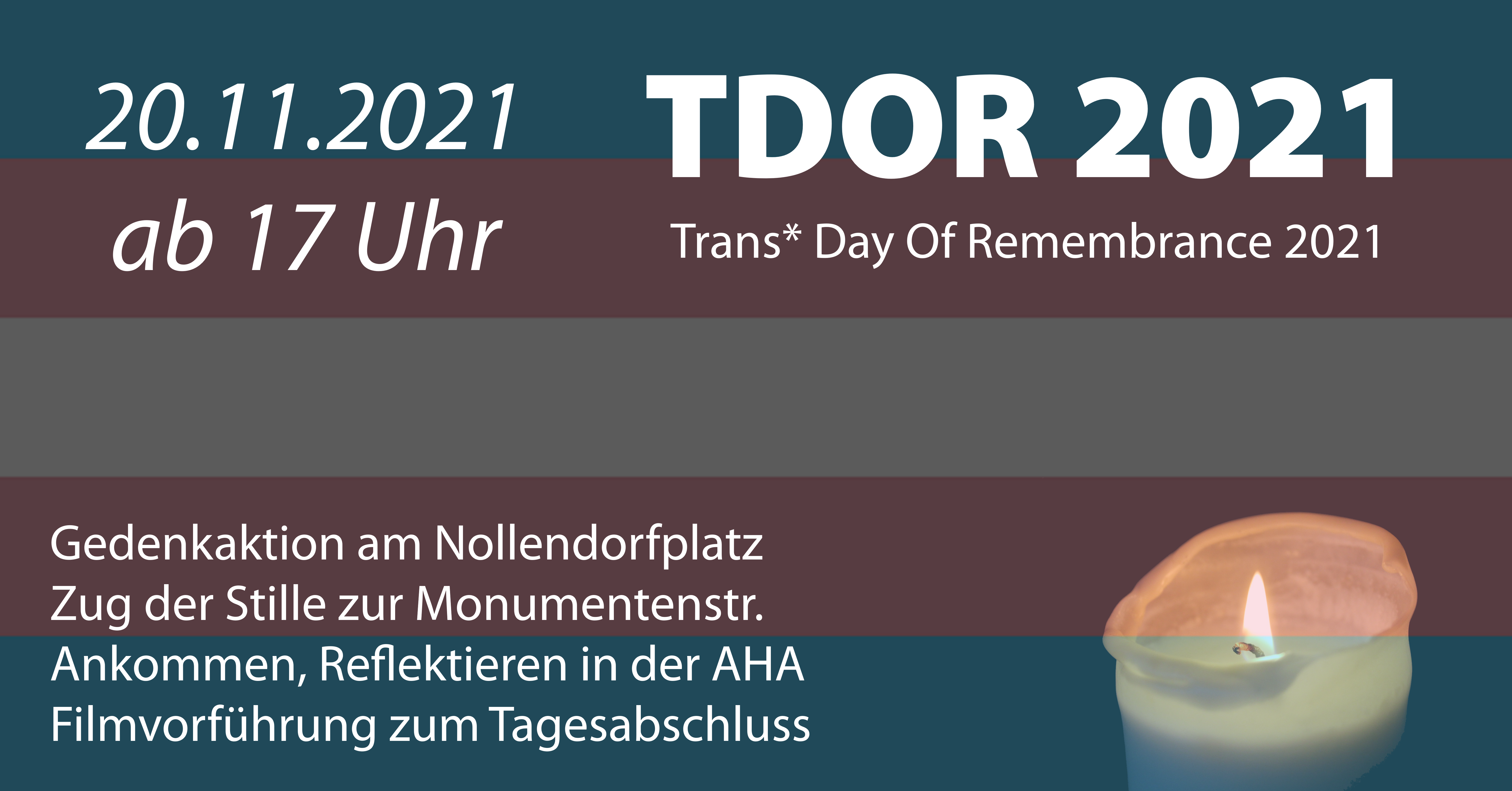 Bereits seit dem letzten TDOR gibt es über 400 bestätigte Berichte über Ermordungen bzw. Suizide nur aufgrund des vermeintlichen nicht-passen in die Erwartungshaltungen an „typisch Mann und Frau“. Die Dunkelziffern sind viel höher. Auch in Berlin als Regenbogen-Hauptstadt ist es wichtig an diesem Tag der Verstorbenen zu gedenken und gleichzeitig ein Zeichen zu setzen „Du bist nicht allein.“. In Berlin gab es erst vor kurzer Zeit einen Suizid (Alexanderplatz), der zeigt, dass es kein abstraktes Thema irgendwo in der Welt ist, sondern auch in Deutschland und in Berlin eine Beachtung bekommen muss. Aus diesem Grund organisieren wir als Aktivitst*innen eine Gedenkveranstaltung mit anschließendem „Zug der Stille“ durch den Regenbogen-Kiez zur AHA-Berlin. Die AHA ist ein queerer Verein in der Monumentenstraße, der uns die Räume für eine Abschlusskundgebung und ein anschließendes Film-Screening zur Verfügung stellt. Aufgrund der zu erwartenden Kälte und der vorhandenen Ausstattung, um einen thematisch passenden Film zu zeigen, sind wir der AHA sehr dankbar für die Zurverfügungstellung der Räumlichkeiten. Ein Hygienekonzept basierend auf der aktuellen Corona-Verordnung liegt vor. Die Filme werden freundlicherweise zur Verfügung gestellt vom Berlin Lesbian Non-Binary Filmfest, eine queere Organisation über die die Lizenzen organisiert werden.
