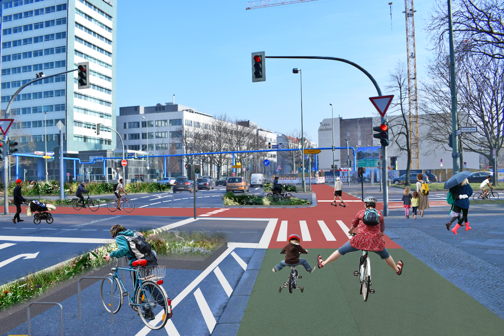 Ziel muss es sein eine möglichst hohe aber auch möglichst gleichmässige Geschwindigkeit im gesamten Stadtgebiet sicher zu stellen. Hierzu ist eine Grüne Welle auf allen viel befahrenen Straßen einzurichten, mit Angabe bei welcher Geschwindigkeit diese erfolgt. Selbst bei einer Welle bei 40km/h wäre ein schnelleres durchkommen im Vergleich zu heute gesichert. Zusammen mit einer Reduzierung der Spuren um mindestens eine je Richtung, stellt sich ein gleichmäßiger Verkehrsfluss ein. Auf diese Weise wird den wenigen Dränglern die Möglichkeit des unnötigen Überholens genommen. Hierdurch wird Platz für die geplanten Fahrradwege freigegeben, und damit weitere Hindernisse beim fortkommen vermieden. Kreuzungen sollen darauf überprüft werden ob ein Abbiegen in beide Richtungen sinnvoll ist, um Rückstau zu verhindern und die Grüne Welle optimaler ausrichten zu können. Vor verbleibenden Kreuzungen Einengung der Spur, und in der Folge Einführung zuerst einer großzügigen Rechts-, und später einer Linksabbieger Spur. Geradeauslaufende Spuren verschenkt sich zwischen diesen. Rechts und links Abbiegen sollte in den Stoßzeiten vom Fußgänger und Fahrradverkehr getrennt geschaltet werden, um einen zu großen Rückstau zu vermeiden, und die Übersichtlichkeit zu erhöhen. Dadurch wird das schnelle Beschleunigen und Rasen einzelner zwischen den Kreuzungen vermieden, die zu außergewöhnlichen Belastungen führen. Weiterhin sollte auf großen Straßen Tagsüber generell kein Langzeitparken zulässig sein, nur noch Kurzparken und Ladezonen, damit Lieferverkehr und Kunden ihre Ziele schnell ansteuern können, nicht in die Quartiere zur Parkplatzsuche ausweichen, oder in zweiter Reihe den Verkehrsfluss stören. Bleibt nur eine Fahrspur übrig ist diese in überbreite auszuführen, um die Rettung oder das Überholen eines Parkwilligen zu ermöglichen. Durch diese Massnahme würde der durchschnittliche Lärmpegel sicher erheblich reduziert werden, aber vor allen Dingen die lauten Spitzen vermieden, die bei starkem beschleunigen und überholen entstehen. Auf dem Bild ist der Hohenzollerndamm Ecke Bundesallee zu sehen, ist aber für alle großen Hauptstraßen gültig. Die Faustregel ist aktuelle Spuren minus eins. In diesem Fall sind aus zwei Fahrspuren zwischen den Kreuzungen eine geworden, zugunsten eines sicheren Fahrradstreifens. Ausserdem ist die Abbiegesituation dargestellt. Es führt nur noch eine Spur gerade aus. Abbiegen fädeln sich aus dieser zuerst nach rechts und dann erst nach links aus. Dadurch ist der Rückstau ausgeschlossen. Zusammen mit einer Grünen Welle ist hier anzunehmen, dass die Leistung der Kreuzung nicht negativ, ggf sogar positiv beeinflusst ist. Außerdem ist zu sehen das der Straßenraum eine höhere Aufenthaltsqualität aufweist.
