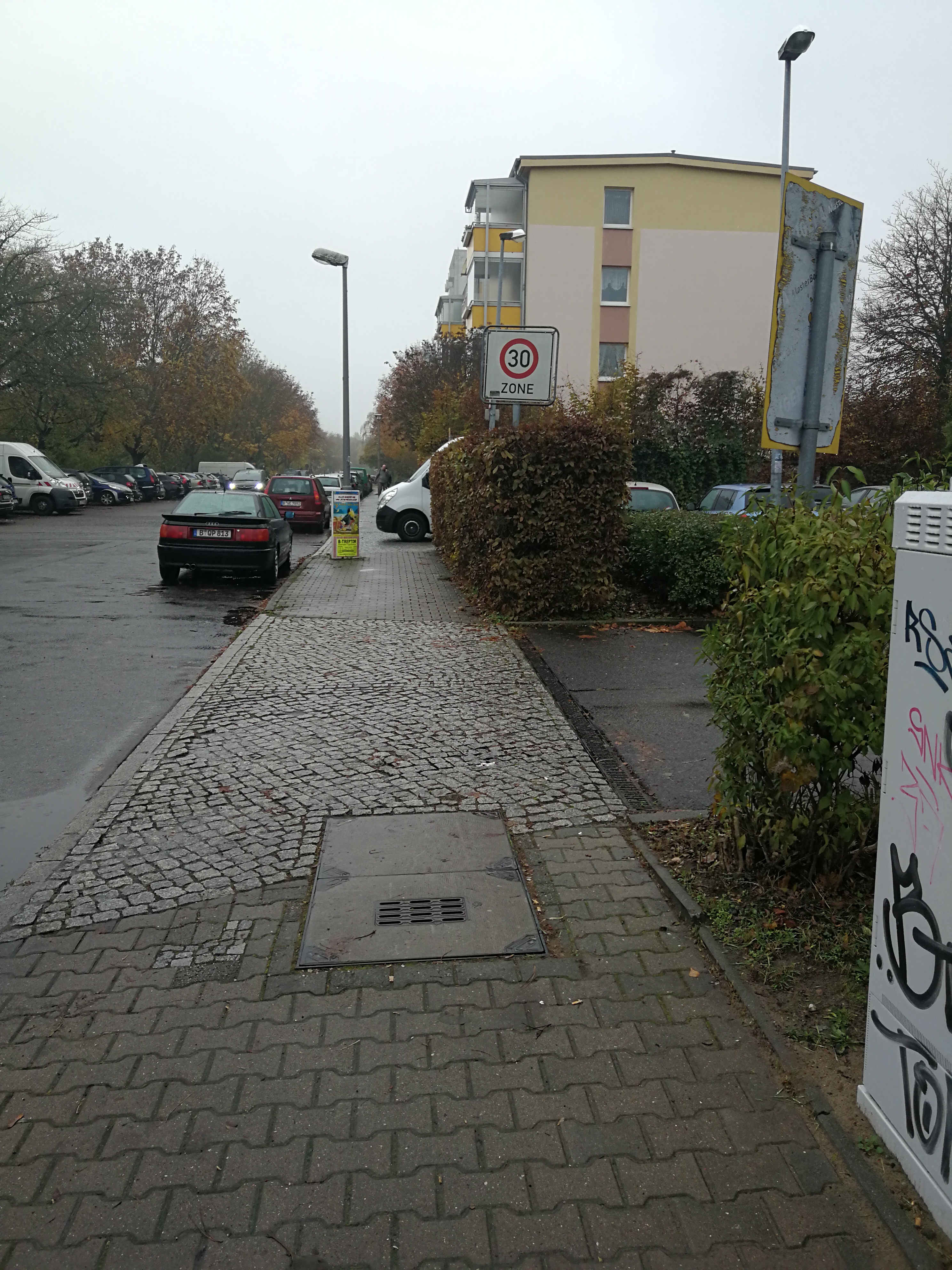 Gefahrenstelle für Fußgänger an Auf- und Ausfahrt des Netto-Discounters in der Hänselstraße. Die Einsicht für ausfahrenden Autofahrer ist wegen der hohen Hecken sehr begrenzt. Besonders Kinder können hier leicht übersehen werden.