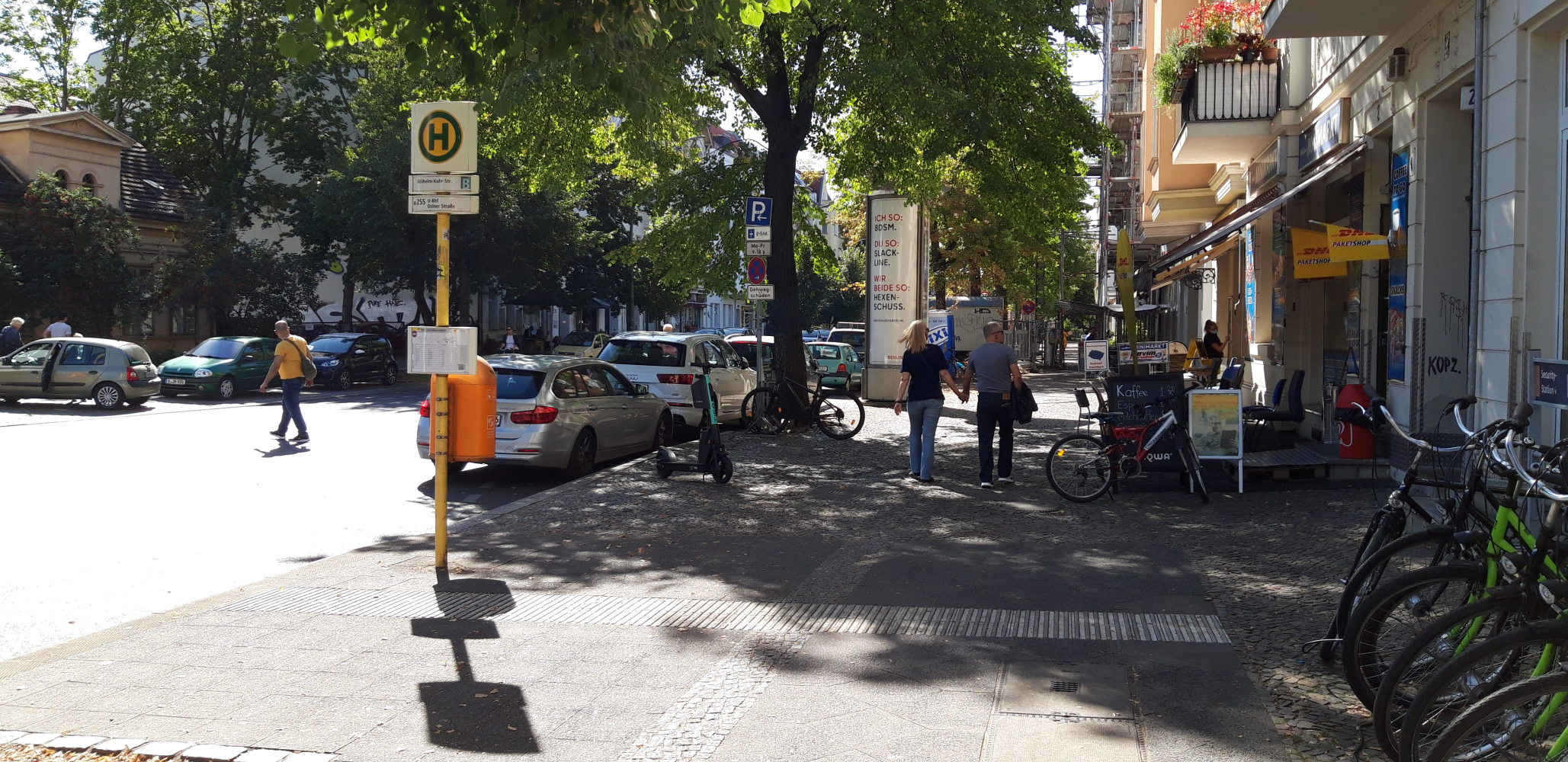 Auf der Verschwenkung des Fahrradstreifens vor dem Parkstreifen parken Kfz regelmäßig falsch und gefährden die Radfahrenden, die in den Fließverkehr ausweichen müssen. Auf der Höhe des Schildes, das den ordungsgemäßen Parkstreifen einleitet, wäre auf der Fahrbahn Platz für eine Abstellanlage mit Elektrorollern. Damit würde der Parkstreifen eindeutig abgegrenzt. Die Roller wären praktisch für Kunden des Pankower Zentrums, die die Wollankstraße Richtung Westen fahren wollen. Alternativ wären auch 1-2 Radbügel möglich.