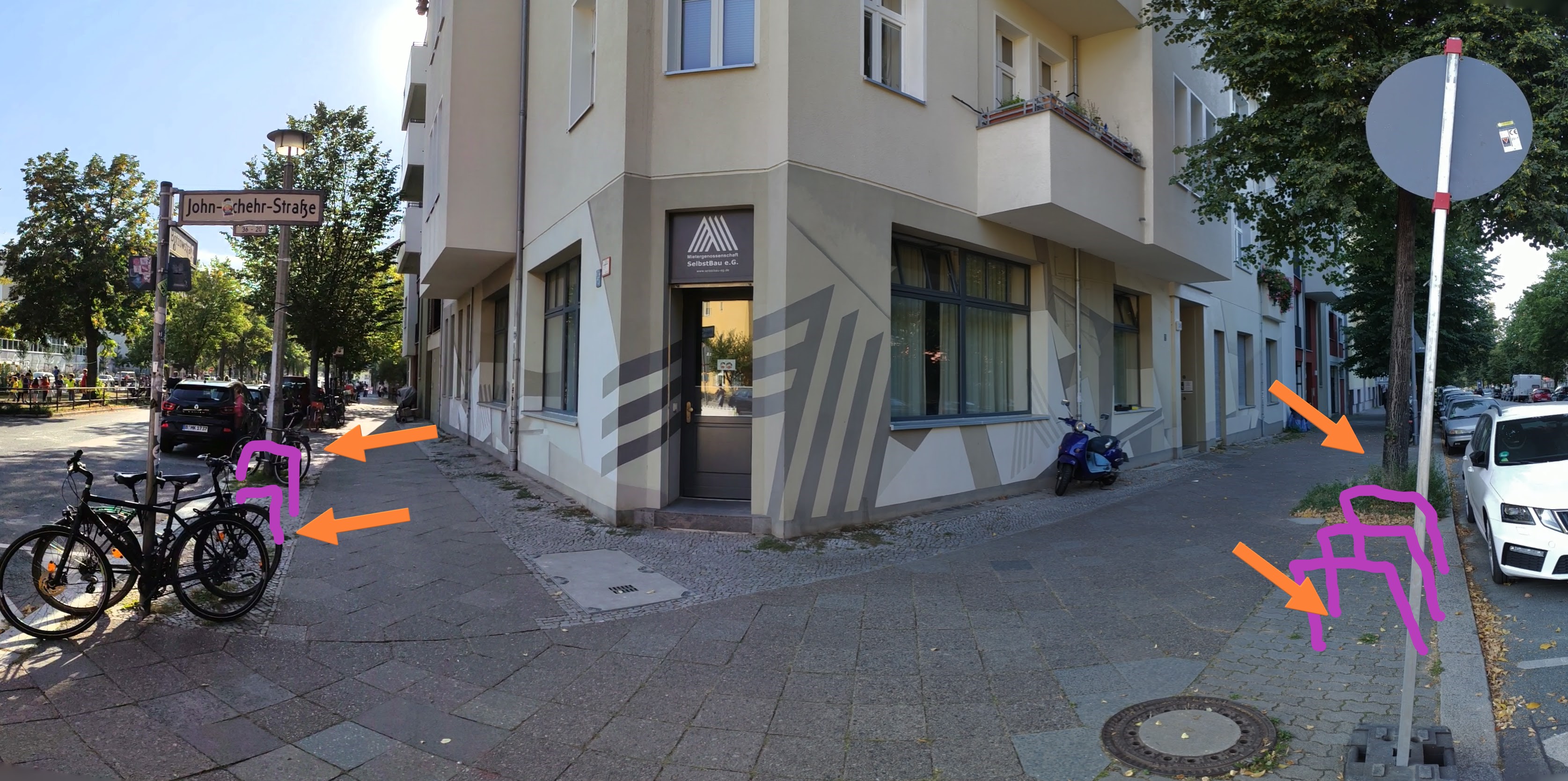 Für Besucher, Gäste und Mitarbeiter der Mietergenossenschaft Selbstbau und für die Bewohner der angrenzenden Häuser wären ein paar Fahrradbügel wünschenswert. Stellplätze an Masten und Bäumen sind begrenzt und die Häuserfassade ist zum Abstellen ungeeignet, da die Räder die Wärmedämmung beschädigen können und zudem nicht gut gesichert angeschlossen werden können.