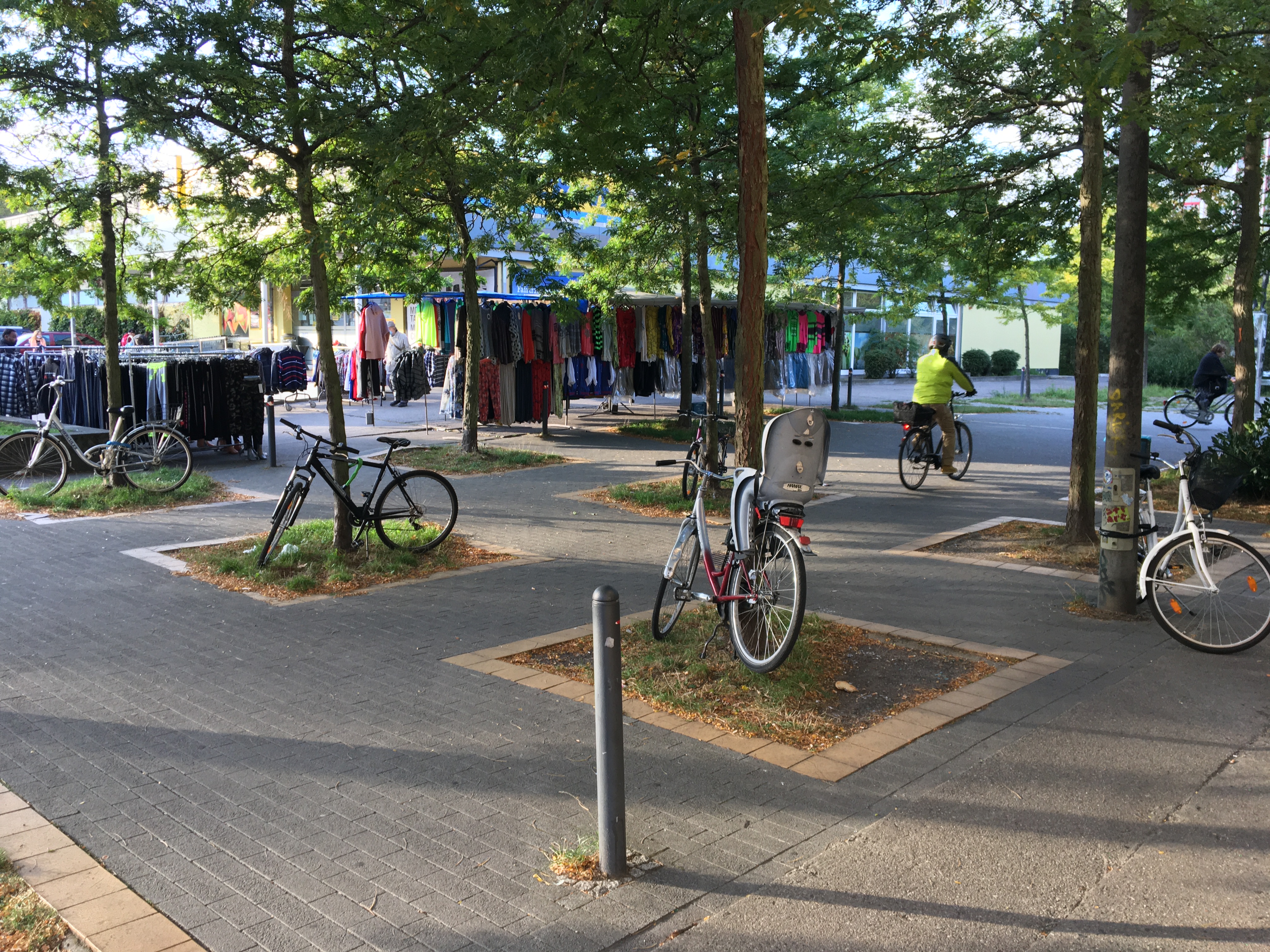 Weder für Kund*innen von Supermarkt und Apotheke, noch für Anwohnende und Gäste gibt es ausreichend Abstellplätze. In der Folge sind Bäume und Bauzäune zugestellt.