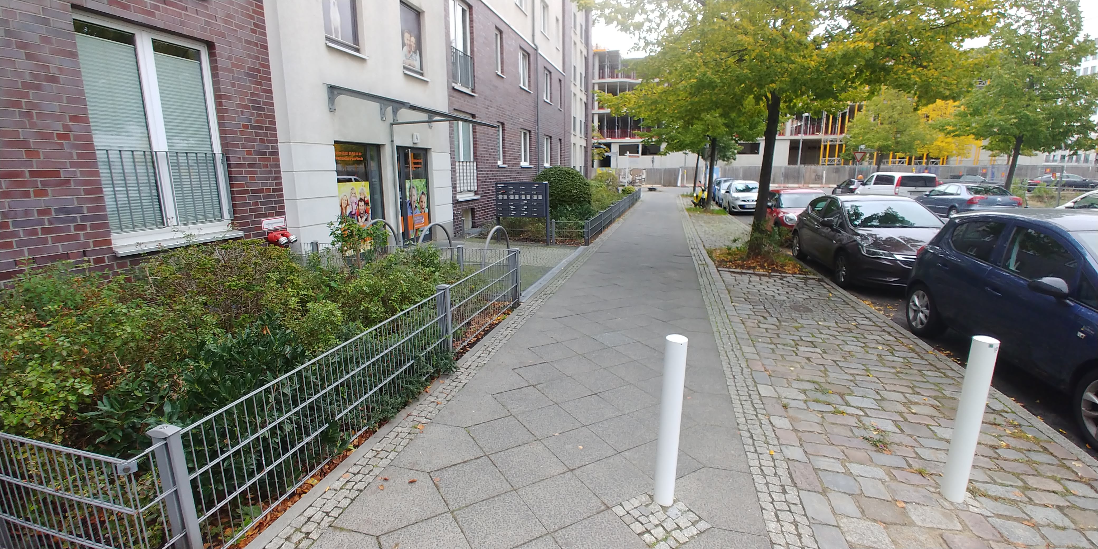 Zwischen Baum und Pollern bietet sich hier eine Stelle für benötigte zusätzliche Lasten- und Radbügel an.
