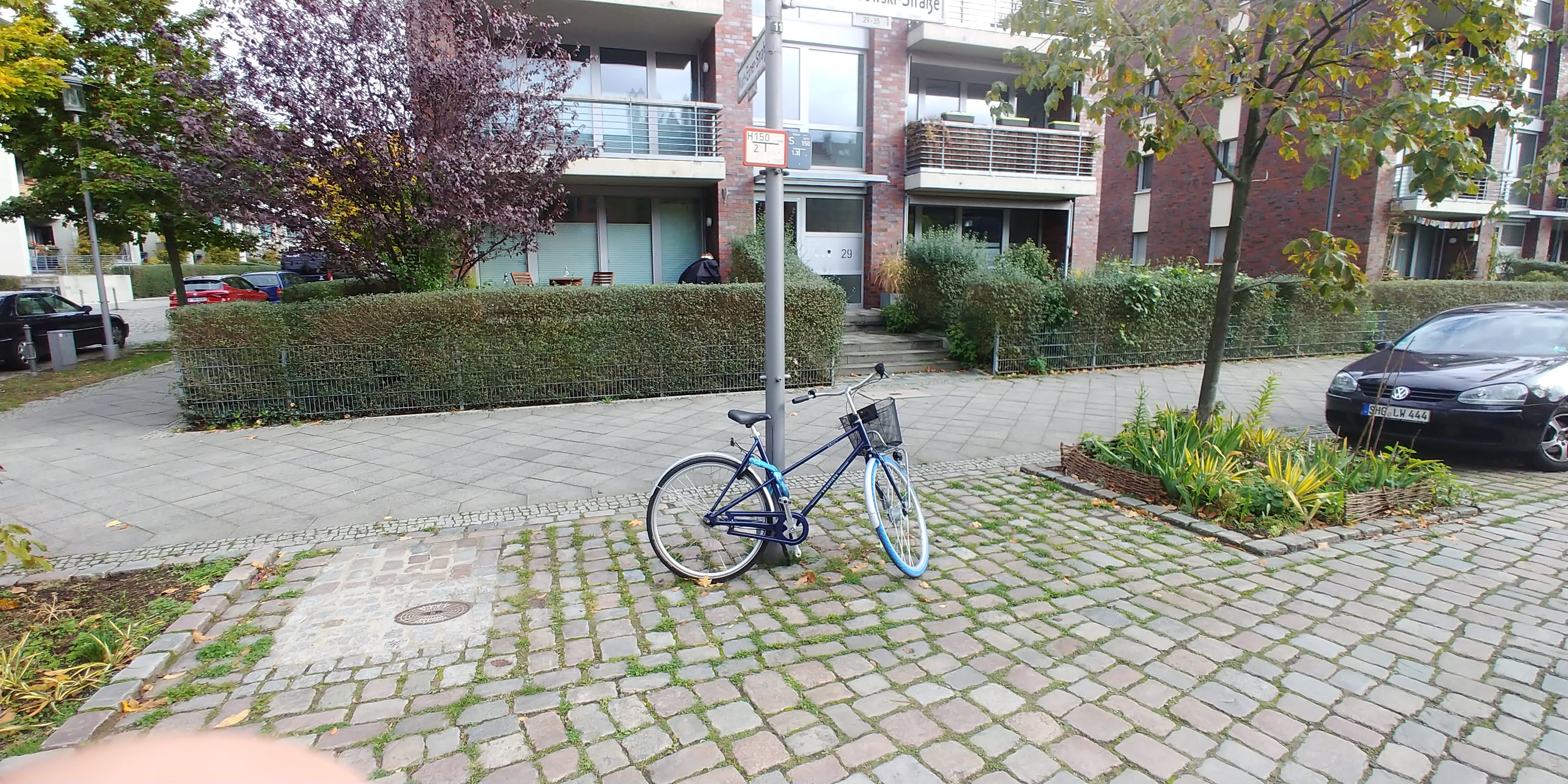 Statt des singulären Laternenmasts, gibt es für Anwohner, wie auch Nutzende des Parks, genügend Bedarf an sicheren Lasten- und Radbügeln, also bitte hier, links und rechts des Masten, mehrere setzen!