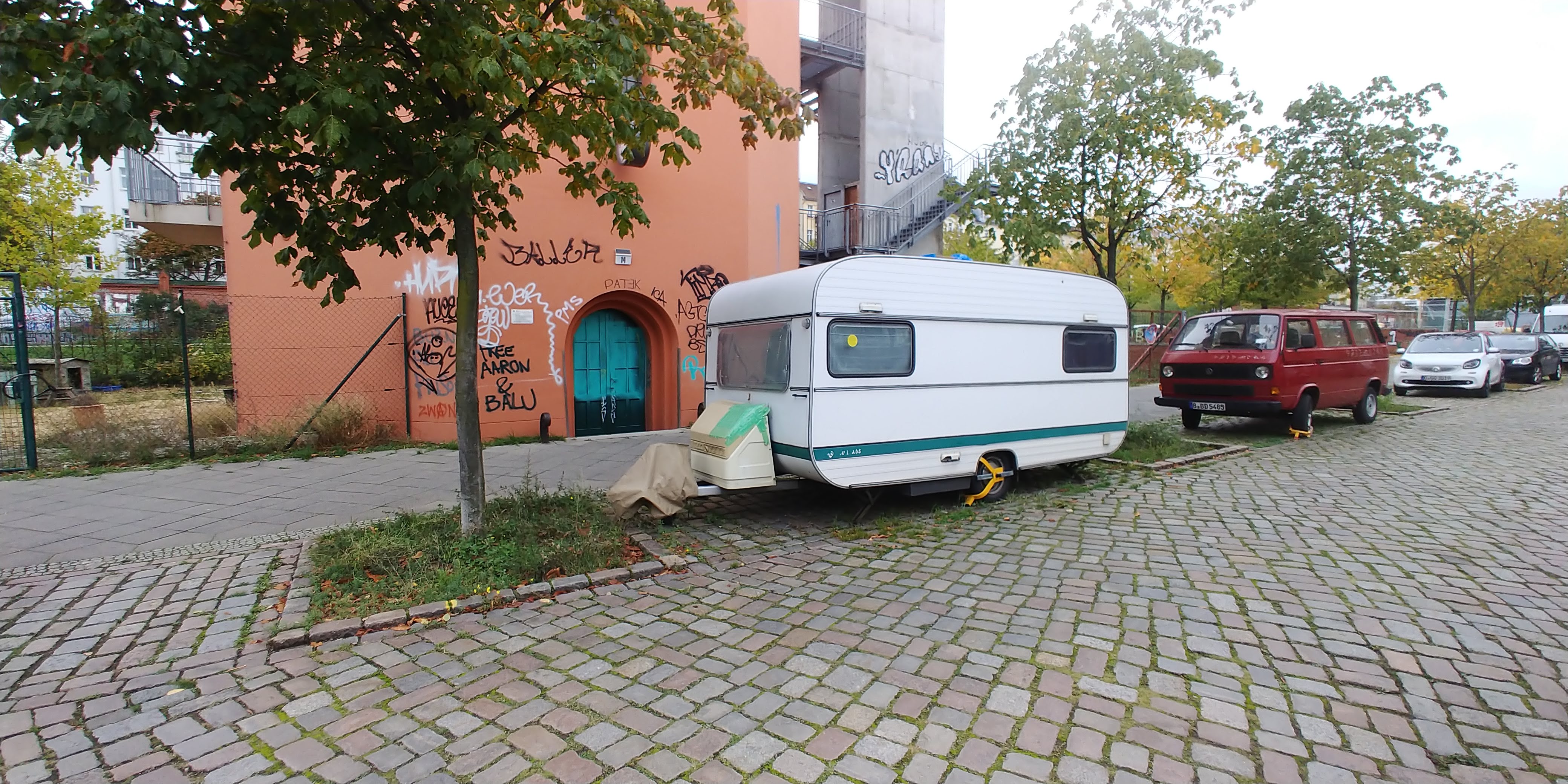 Der direkte Zugang zum Portal des Wasserturms im Hausburgpark wird u.a. durch gratis dauerparkende Kfz und deren Anhänger zugestellt.