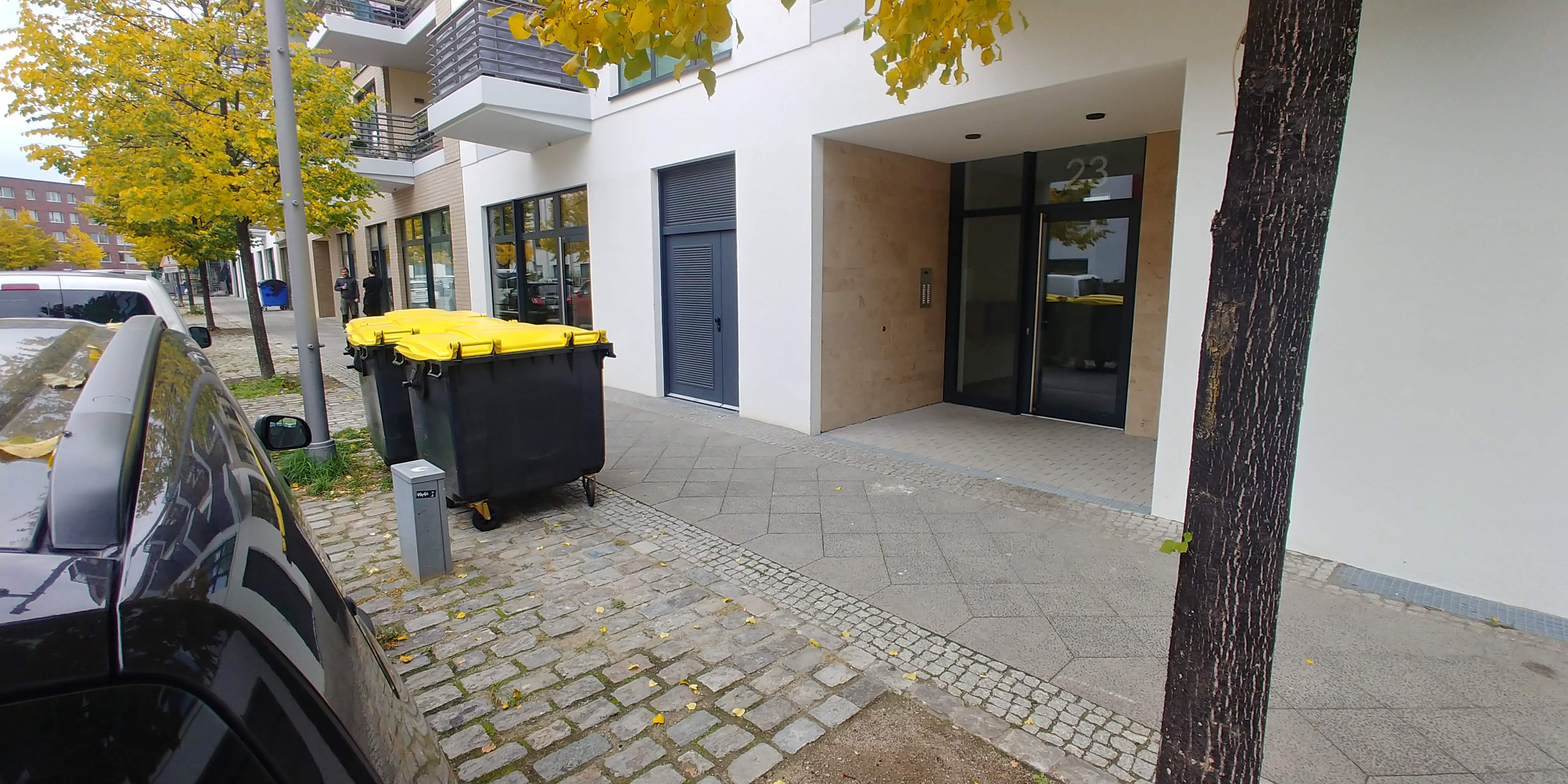 Auch vor der Hausnr. 23 bietet sich der gepflasterte Streifen, um die Laterne herum, zum Platzieren von Lasten- und Radbügeln an, wodurch auch der kleine Fernmeldekasten, wie auch die Baumscheiben und jungen Bäume selbst, mit vor Parkremplern geschützt würden.