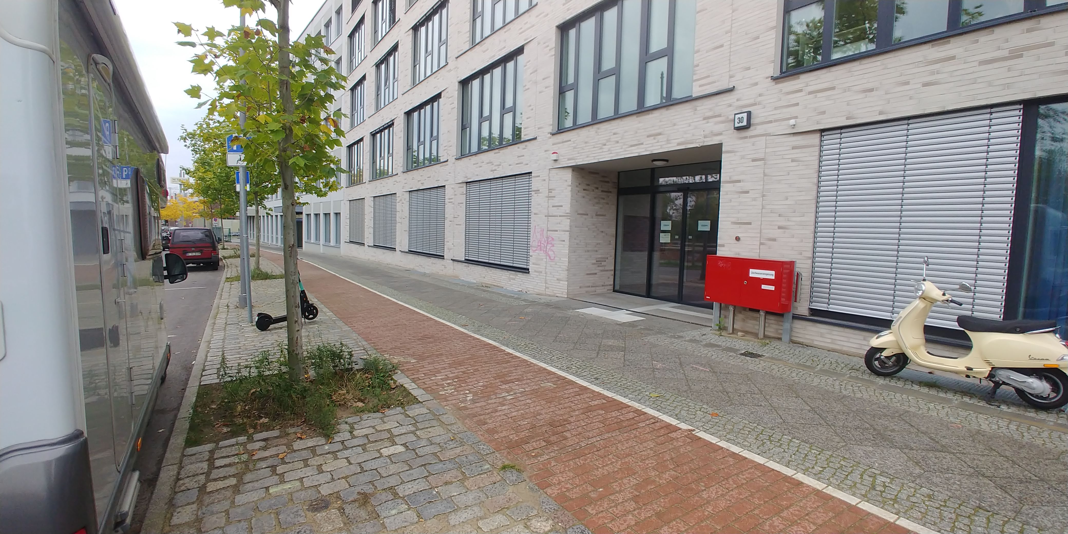 Vor dem Eingang zum Bürogebäude bietet sich der gepflasterte Streifen dafür an, um entlang der Strasse sichere Radbügel, in mehr als ausreichender Anzahl, längs zu platzieren.