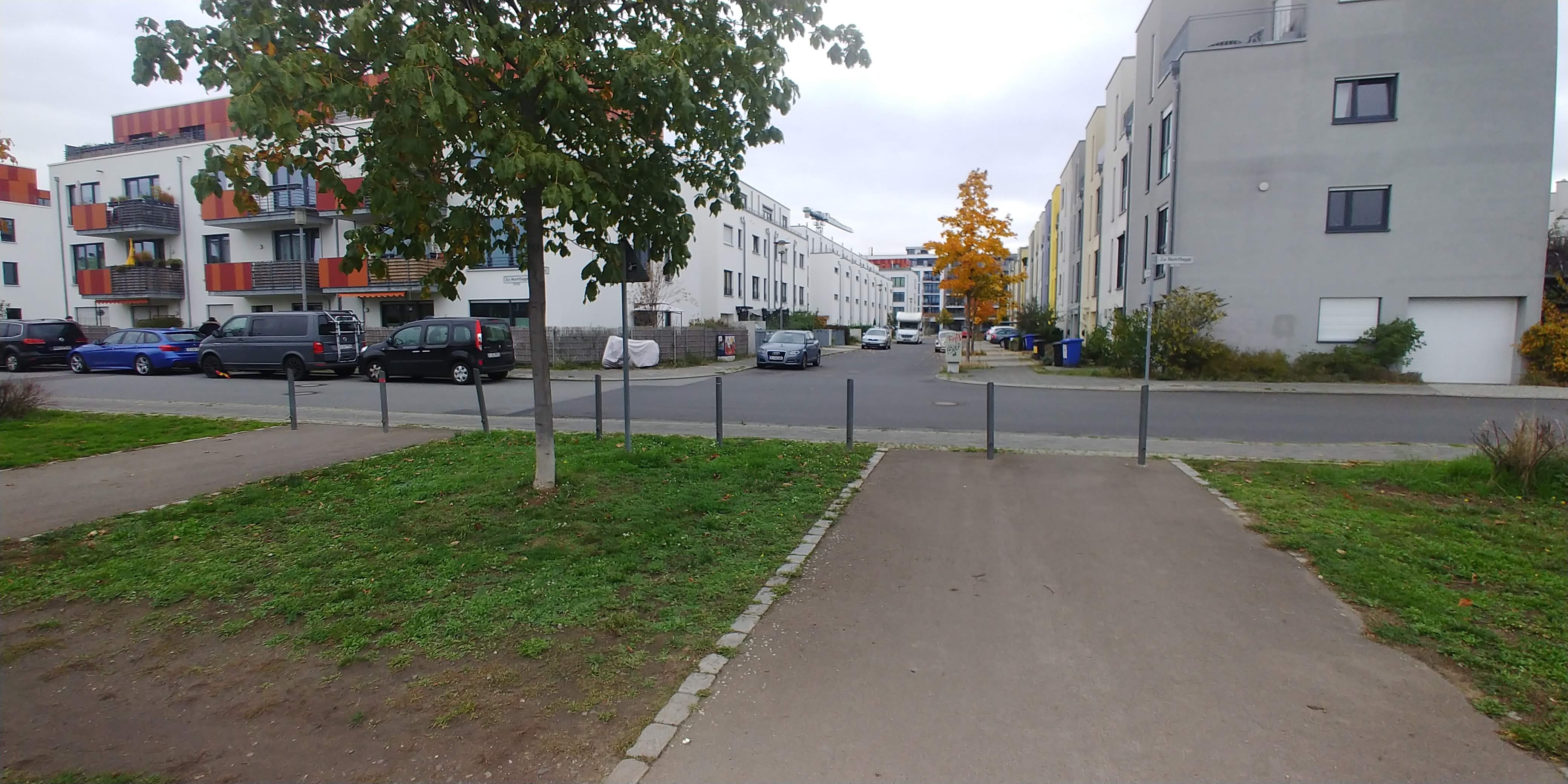 Anstelle dieses Spaliers an Pollern, wären sowohl links, rechts und auch zwischen den, die Grünfläche mittig querenden, asphaltierten Fusswegen mehrere (Lasten)Radbügel denkbar. Diese würden, genau wie auch die Poller, das Befahren durch Kfz verhindern, aber gleichzeitig dringend benötigte Radbügel für die vielen NutzerInnen der Grünfläche bieten.
