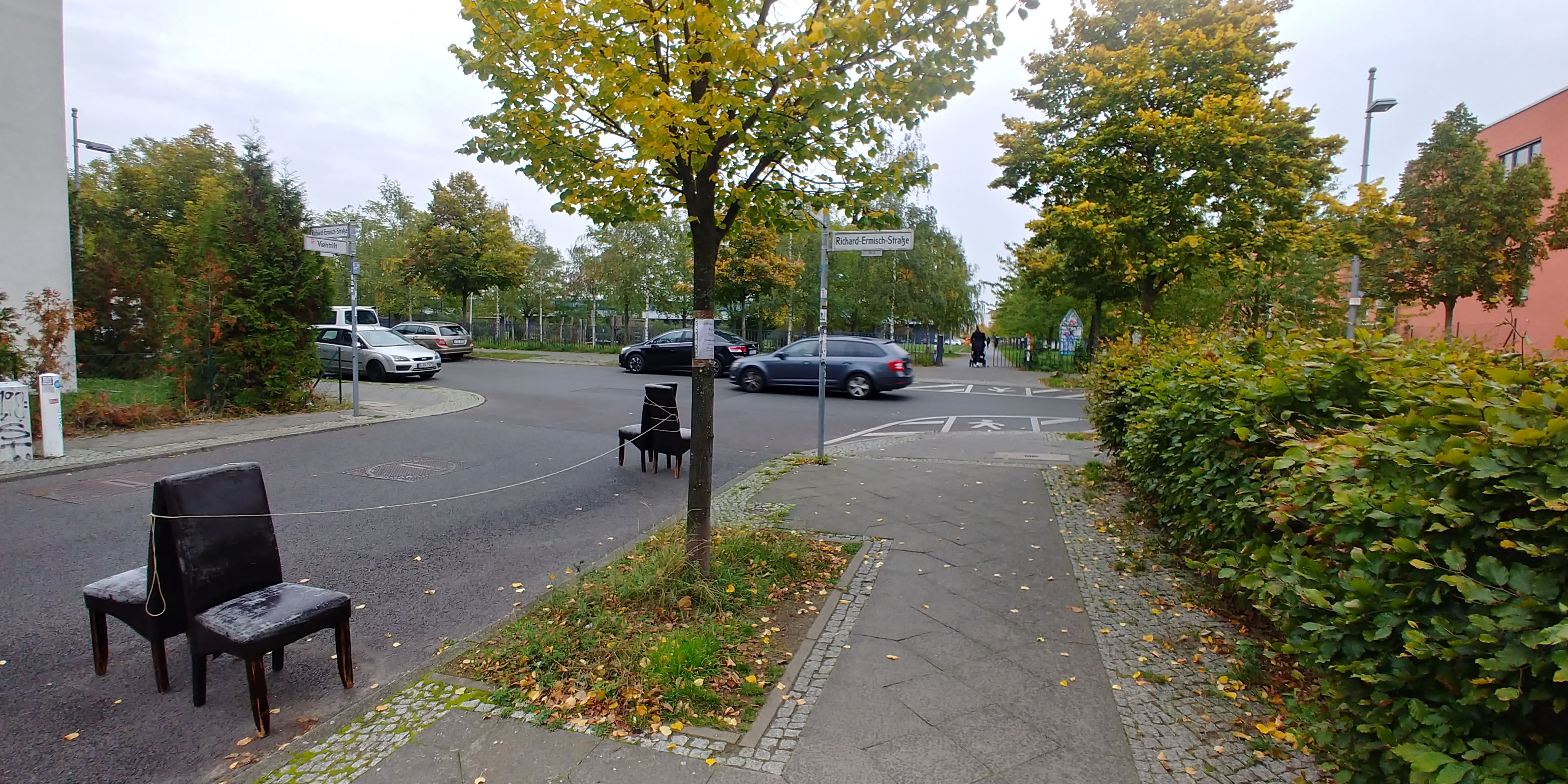 Nicht anstelle der Stühle, aber im nicht zu beparkenden 5m Bereich vor der von zu Fuss gehenden rege genutzten Kreuzung, könnten hier, zwischen Strassenschild und dem Baum, längs positioniert, wenigstens ein einziger Fahrradbügel installiert werden, welcher damit die Zahl der sicheren Abstellanlagen in der gesamten Umgebung(!) gleich, um glatte 100%, steigern würde. Auch die Kfz-Halter würden evntl. davon abgehalten werden, besonders des Nachts, bis in den Kreuzungsbereich hinein zu parken und damit die sichere Querung und die Schleppkurve für BSR und Noteinsatzfahrzeuge einzuschränken.