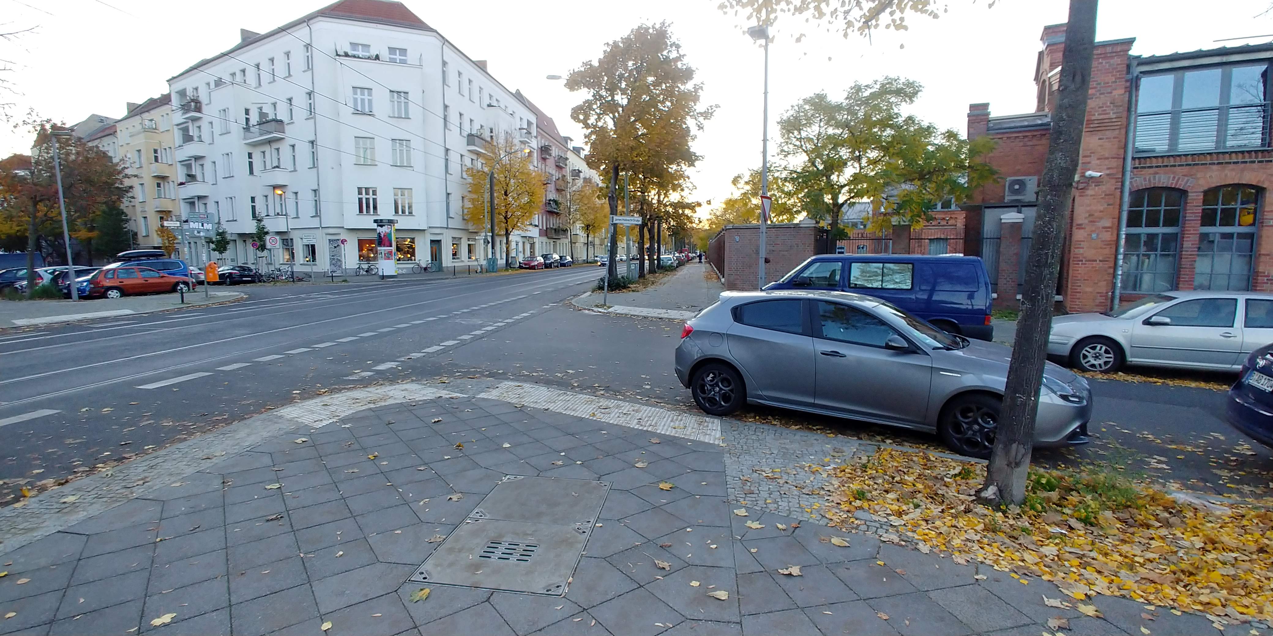 An dieser Kreuzung mit der Eldenaer Strasse, gleich neben der Tramhaltestelle, werden die Überwege über die James-Hobrecht-Strasse regelmässig, d.h. täglich und nächtlich (wie auch auf dem Foto, mitten am Tage, schon recht gut zu erkennen), zugeparkt.