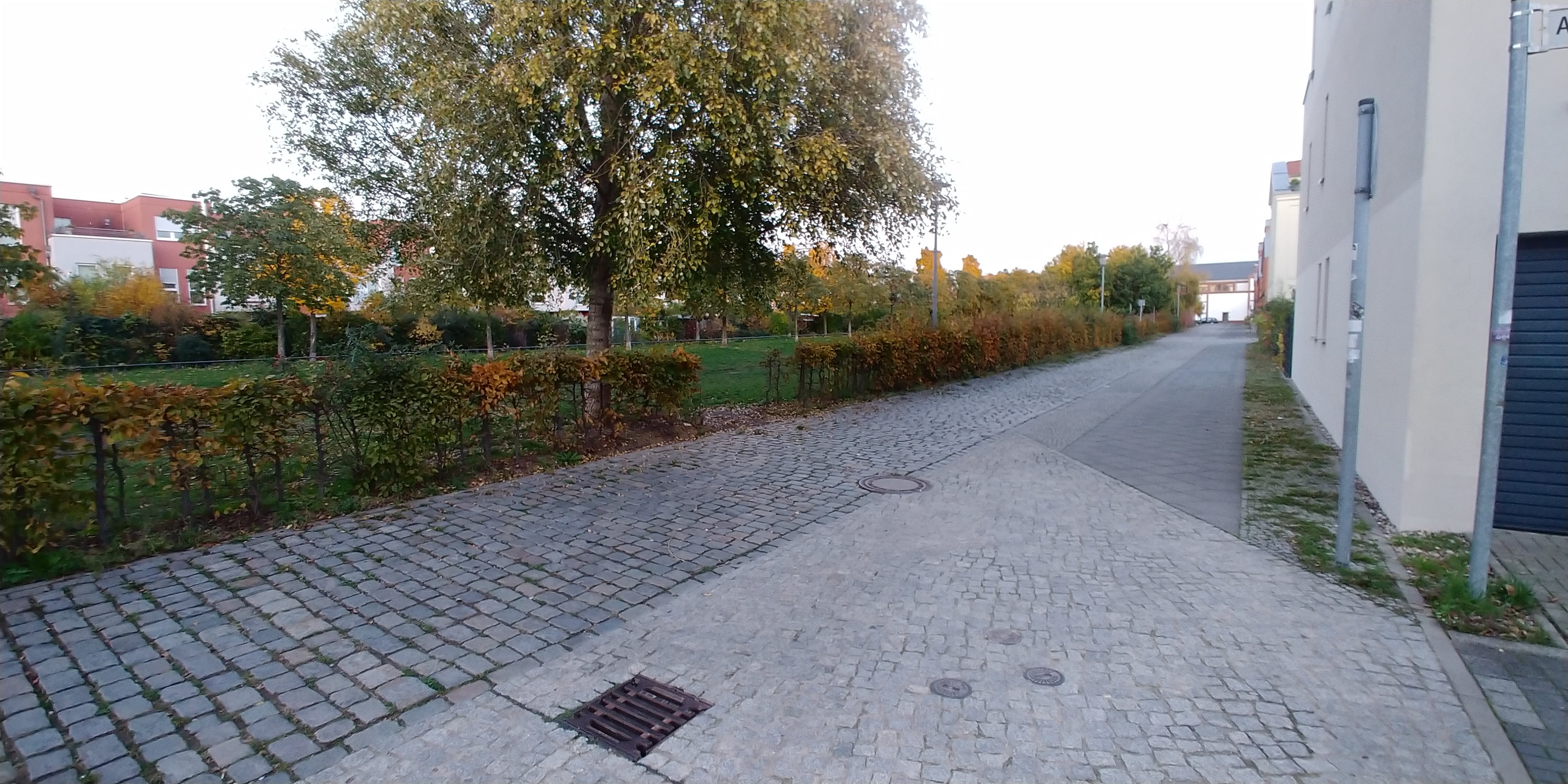 Eine Möglichkeit dem Abhilfe zu schaffen, ohne die Grünfläche selbst oder den schmalen Fussgängerweg entlang der Nordseite zu belegen, wäre, jeweils im Bereich der Giebel der Reihenhäuser, auf Haus- und/oder Parkanlagenseite, mehrere (Lasten)Radbügel zu platzieren.