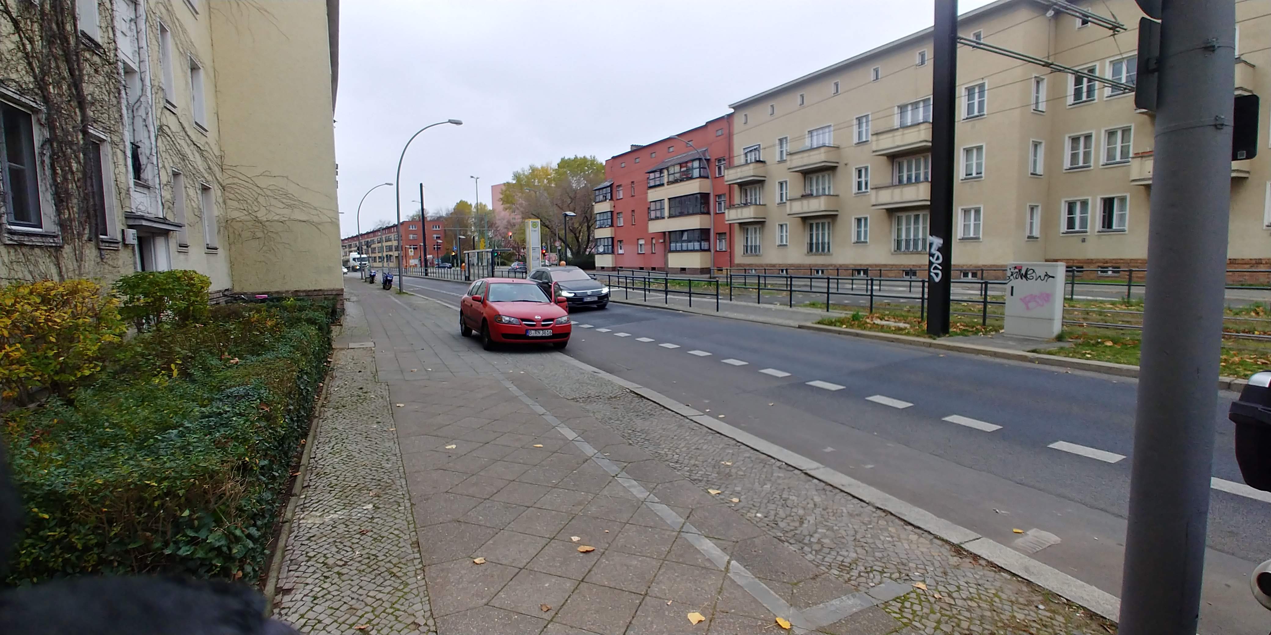 Der sich hier, nach der Tramhaltestelle, kurzzeitig weitende Gehweg sollte mit mehreren Radbügeln, statt mit Falschparkern, besetzt werden.
