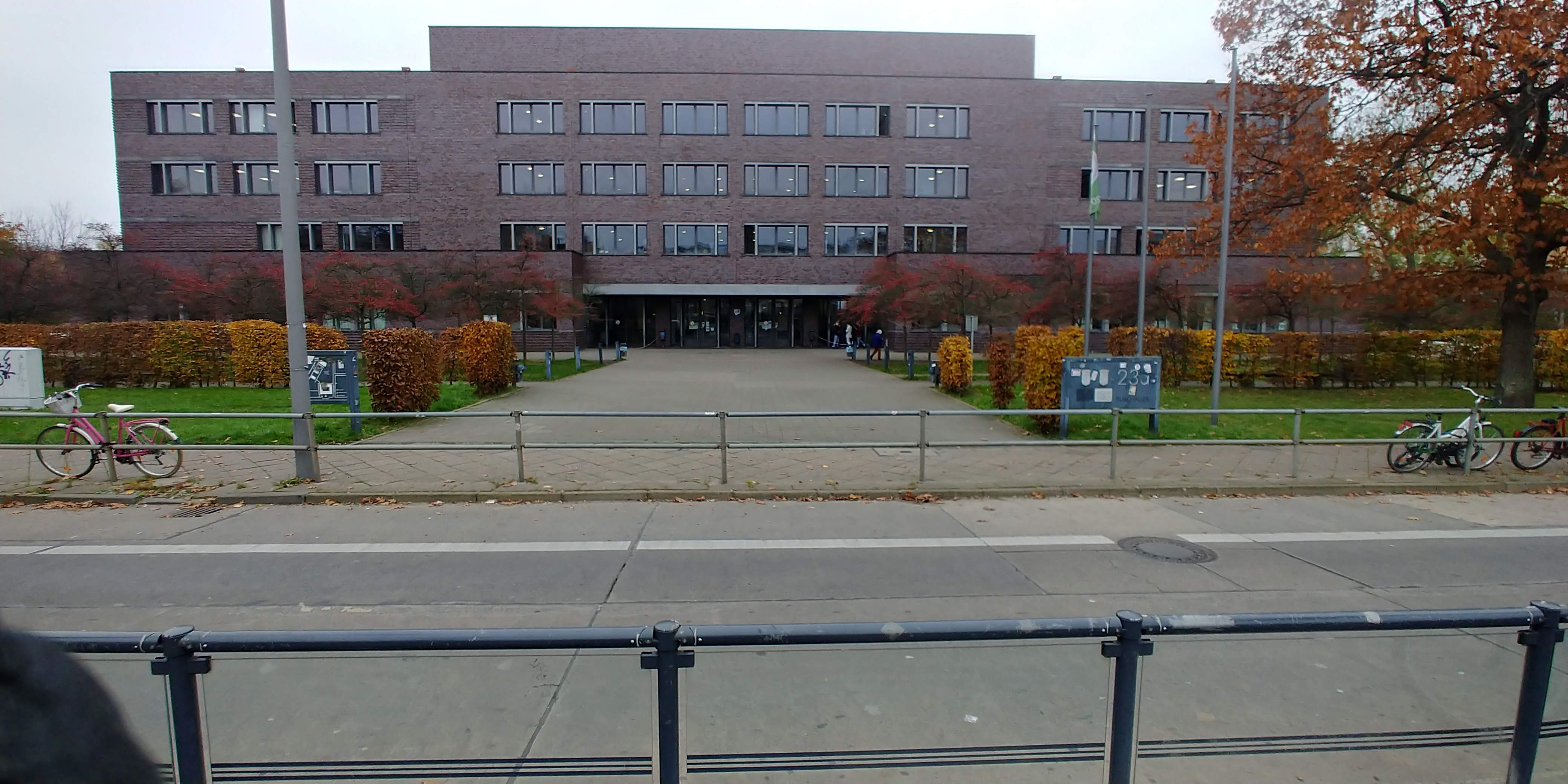 Entlang des Vorplatzes der Schule, links und rechts zum Grün und zur Buschallee und Haltestelle hin, könnte endlich eine ganze Reihe an sicheren Lasten- und Fahradbügeln installiert werden.