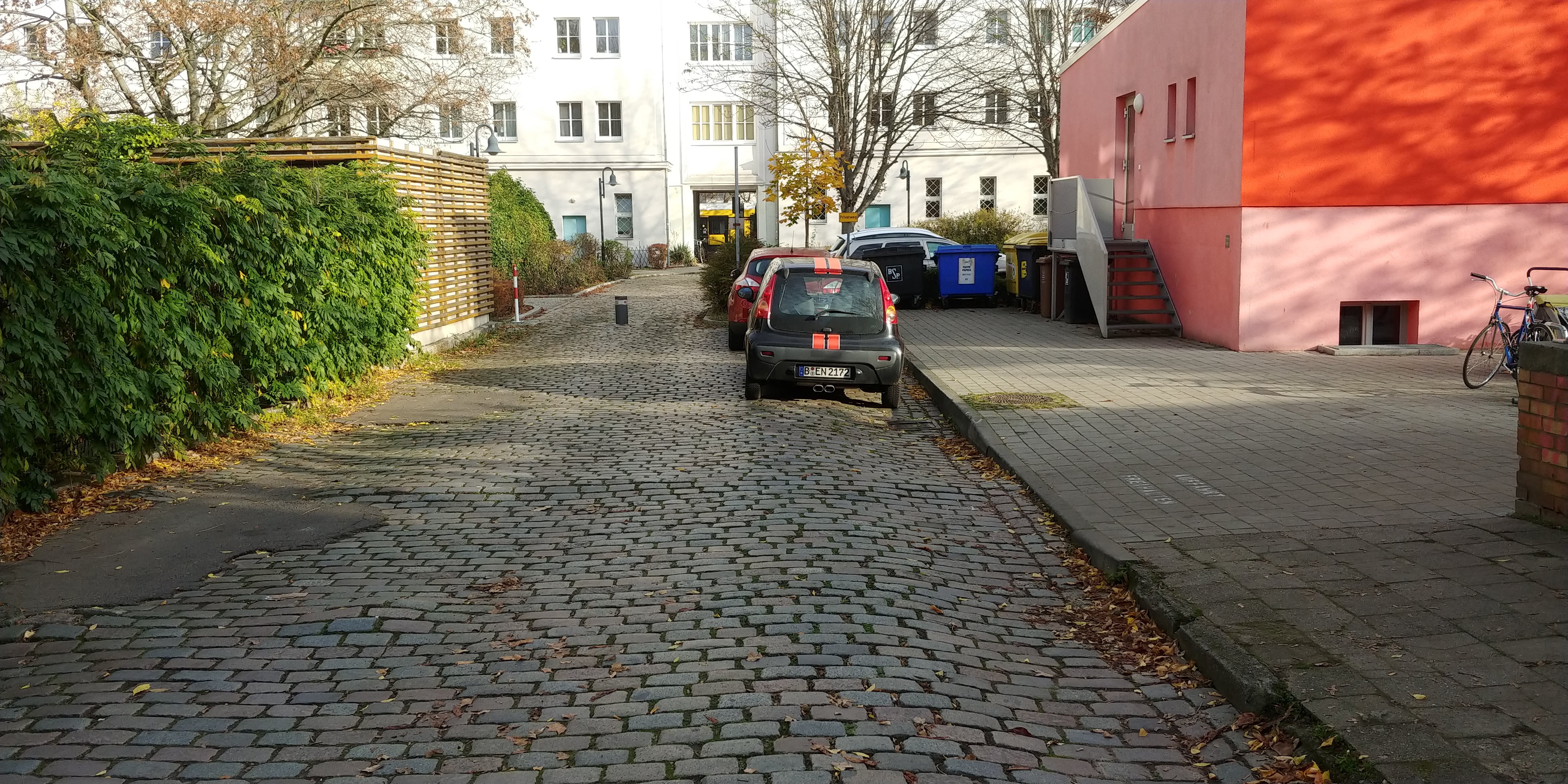 Statt hier auch noch den letzten Meter zuzuparken und in der engen Sackgasse vor der Kita das ständige Ein- und Ausfahren von Kfz zu dulden und dadurch vor allem die ein- und ausgehenden Kinder, aber auch hier durch den Hof des Quartiers laufenden und radelnde Passanten permanent zu gefährden, sollten in diesem öffentlichen Strassenbereich anstelle der ,Parkplätze', entlang der Bordsteinkante, mehrere (Lasten)Radbügel platziert werden.