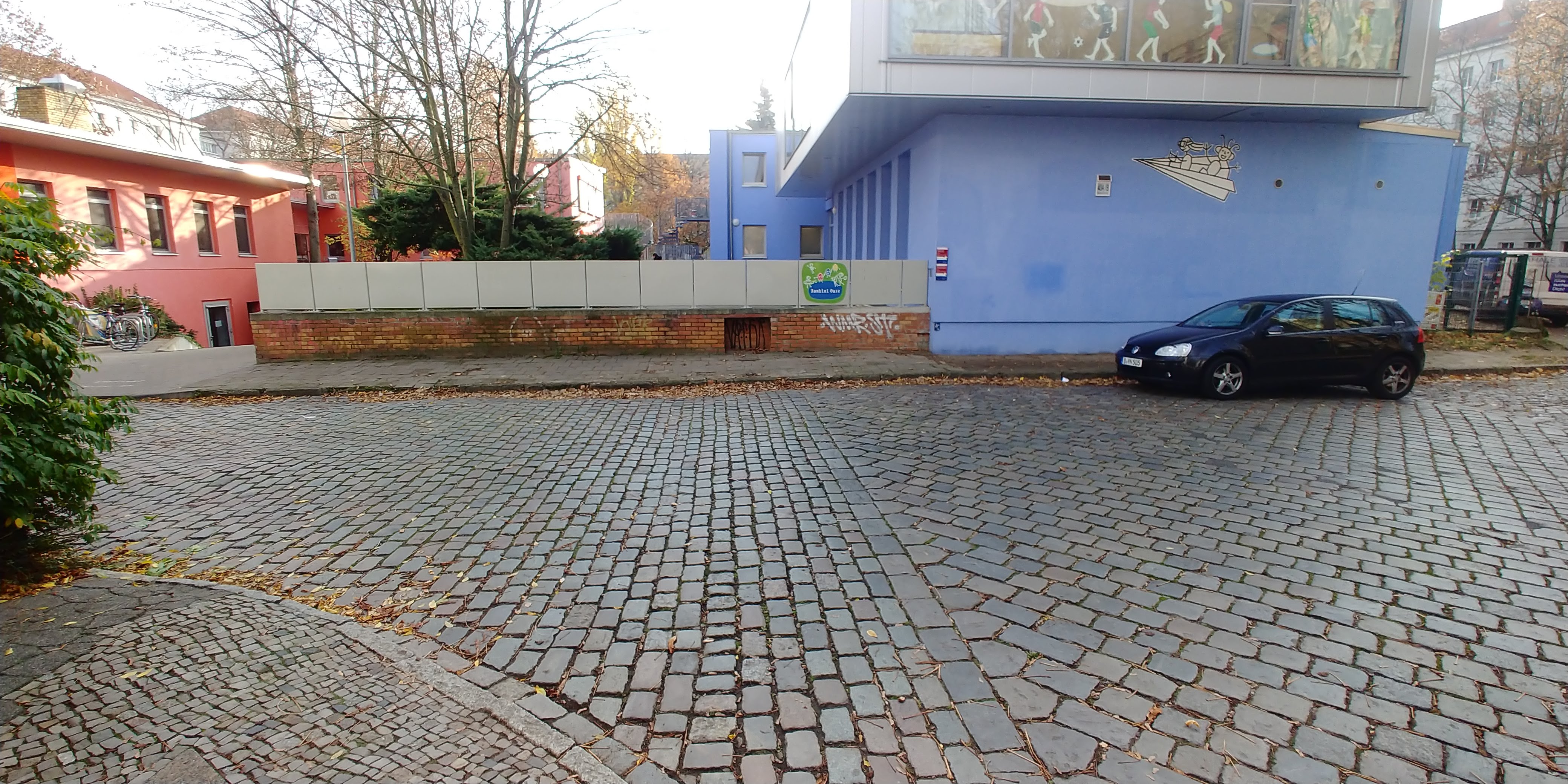 Um diesen ,Wendehammer', direkt vor dem Eingang zum Kindergarten, vom täglichen gefährdenden, ein- und ausfahrenden Parkplatzsuchverkehr permanent freizuhalten, sollten zwischen dem absenkbaren Poller zum Innenhof, rechts, und der angesichts des regen Eltern und Kindverkehrs viel zu engen abgesenkten Bordsteinkante, links, eine ganze Reihe an (Lasten)Radbügeln installiert werden.