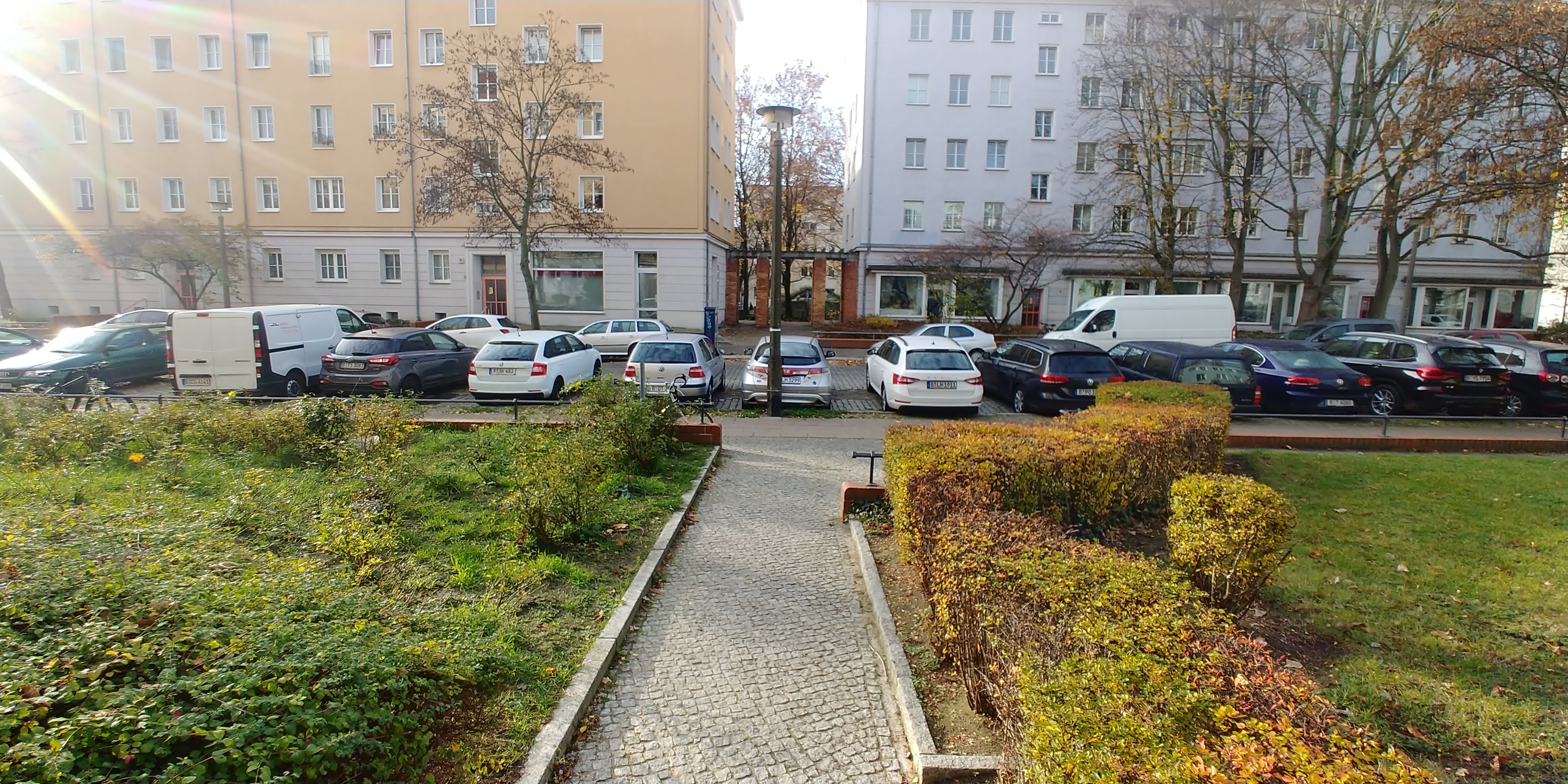 An dieser Stelle bietet es sich deshalb an, um die Laterne herum, ein paar wenige der bisherigen Parkplätze zu entnehmen und dafür den öffentlichen Strassenraum hier mit Lasten- und Fahrradbügeln zu besetzen, bei gleichzeitiger Absenkung der bestehenden extrem hohen Bordsteinkanten, und einer ausreichend freien Furt durch die neu zu platzierenden Radbügel.