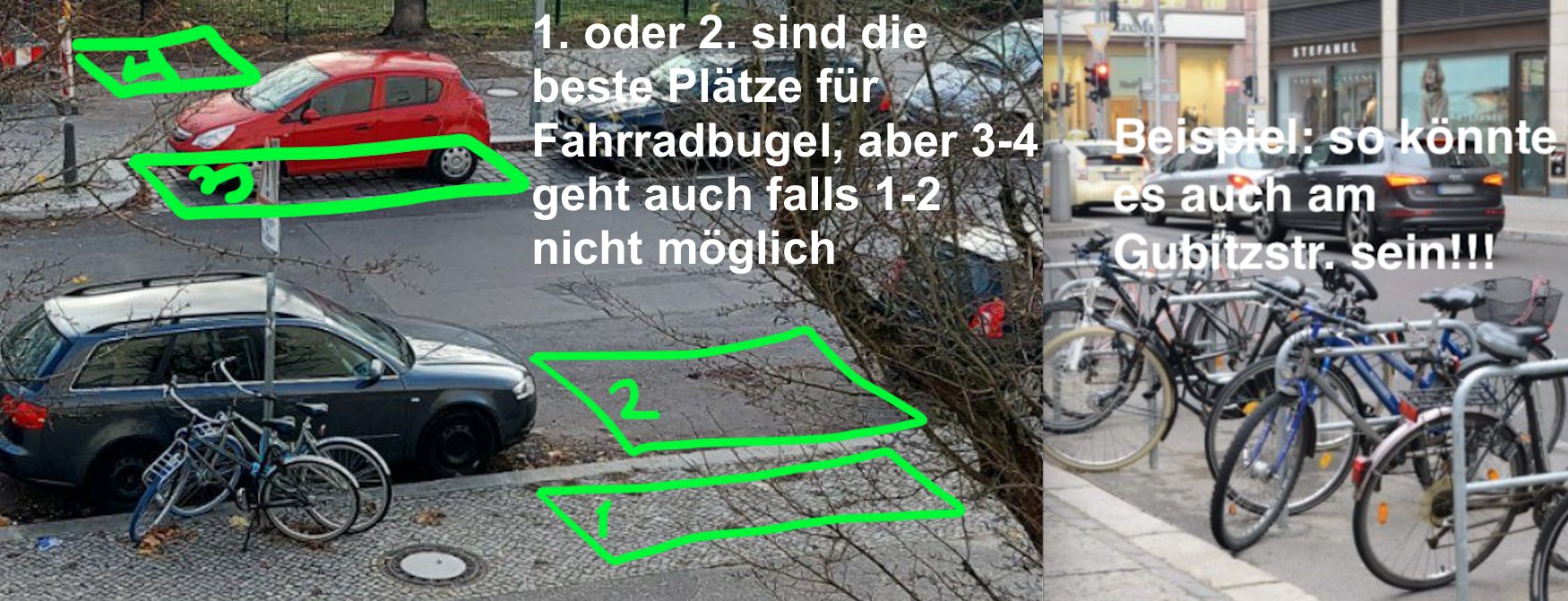 Zum Beispiel anstatt 1 PKW Parkplatz es könnte 5 Bugeln da stehen, gibt auch andere möglichkeiten – neben dem Baum oder Zaun von Ballettschule – siehe Photos. Am besten wäre es die Fahrradbügeln doch direkt vor den Häusern Gubitzstr. 32–36 zu installieren (Plätze 1 und 2 auf die Photo) – die Fußweg ist sehr breit und es gibt schon Fahrradbugeln neben andere Hauser in Carl Legien Siedlung – deswegen soll Denkmalschutz kein Problem sein.
