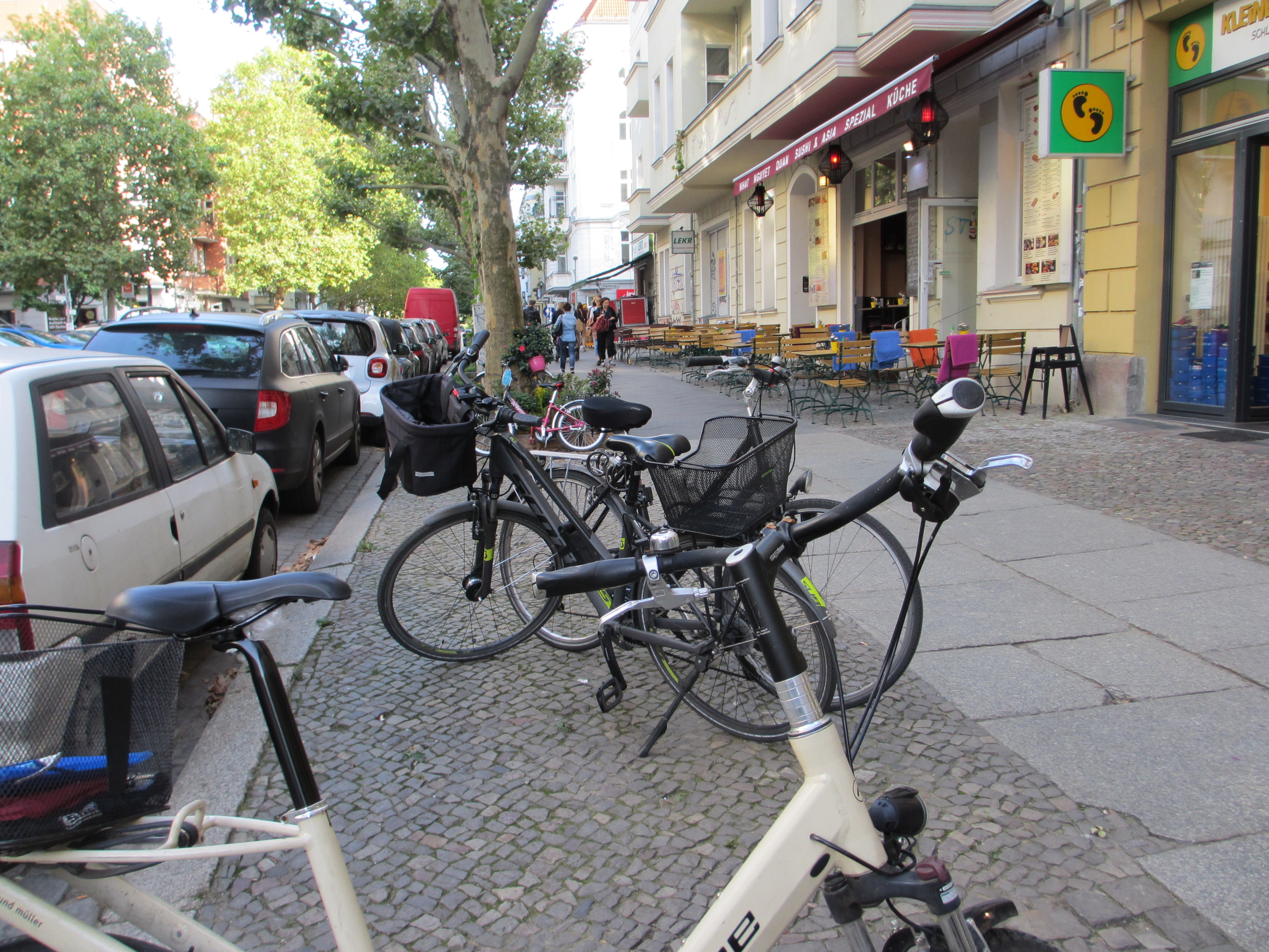 In der Hufelandstr. gibt es Bügel, aber zahlenmäßig nicht dem Bedarf entsprechend, z.B. im Bereich vom Friseur Abschnitt 22 über Alt-Wien über Schuhgeschäft 'Kleine Schritte' bis zum Lebensmittelladen Lekr.