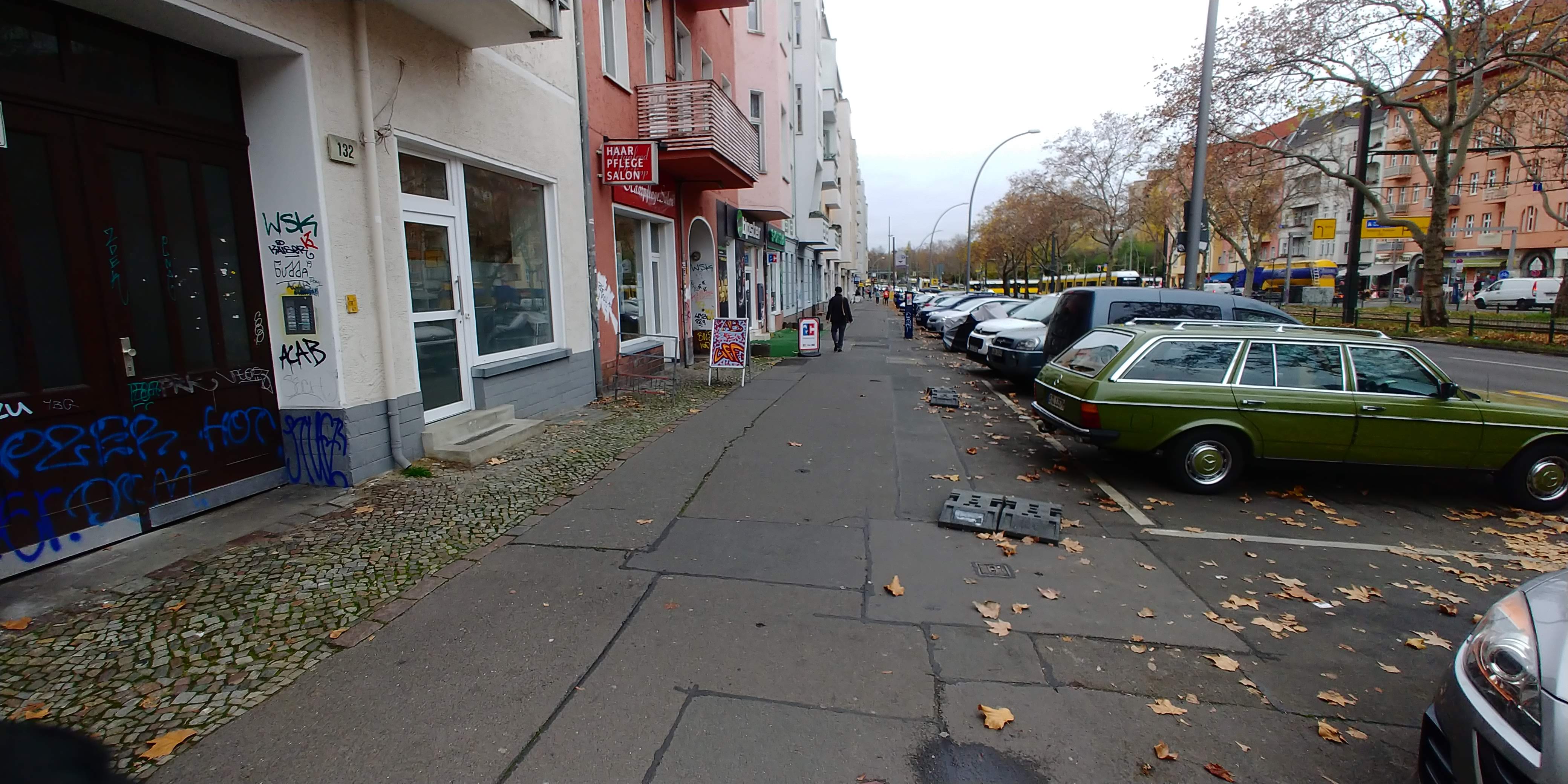 Auch hier gilt es die nur scheinbar so undurchdringliche Reihe an endlosen einfach nur abgestellten Kfz zu durchbrechen, um für beide Hauseingänge, an der Laterne, einen sicheren Stellplatz für die (Lasten)Räder der vielen Bewohner und Kunden, und nicht nur für Fahrradfahrende, einen direkten Zugang zur Strasse zu schaffen.