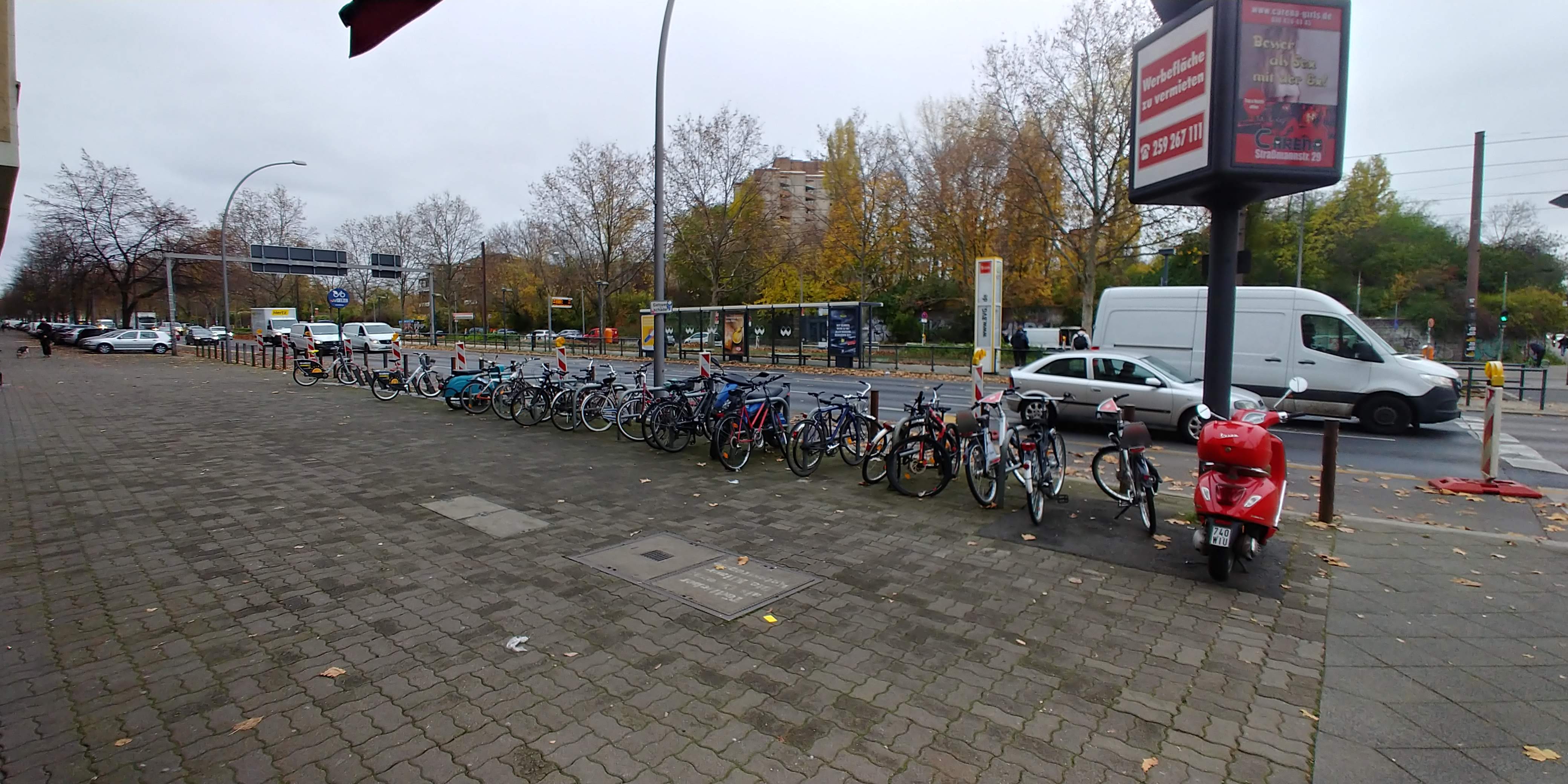 Die hier schon bestehenden Abstellanlagen sind zu den Stosszeiten meist voll ausgelastet. Eine zweite, also doppelte Reihe, statt einer Ergänzung weit am Ende der jetzigen Reihe von Mieträdern, wäre angesichts des hier sehr breiten, aus westlicher Richtung untergenutzen Gehwegs zu planen und alsbald umzusetzten, damit aus den umliegenden Kiezen bis hier ran radelnde NutzerInnen des ÖPNV auch auf dieser Seite des Verkehrsknotenpunkts Danziger/Greifswalder jederzeit genügend freie und sichere Abstellanlagen vorfinden.