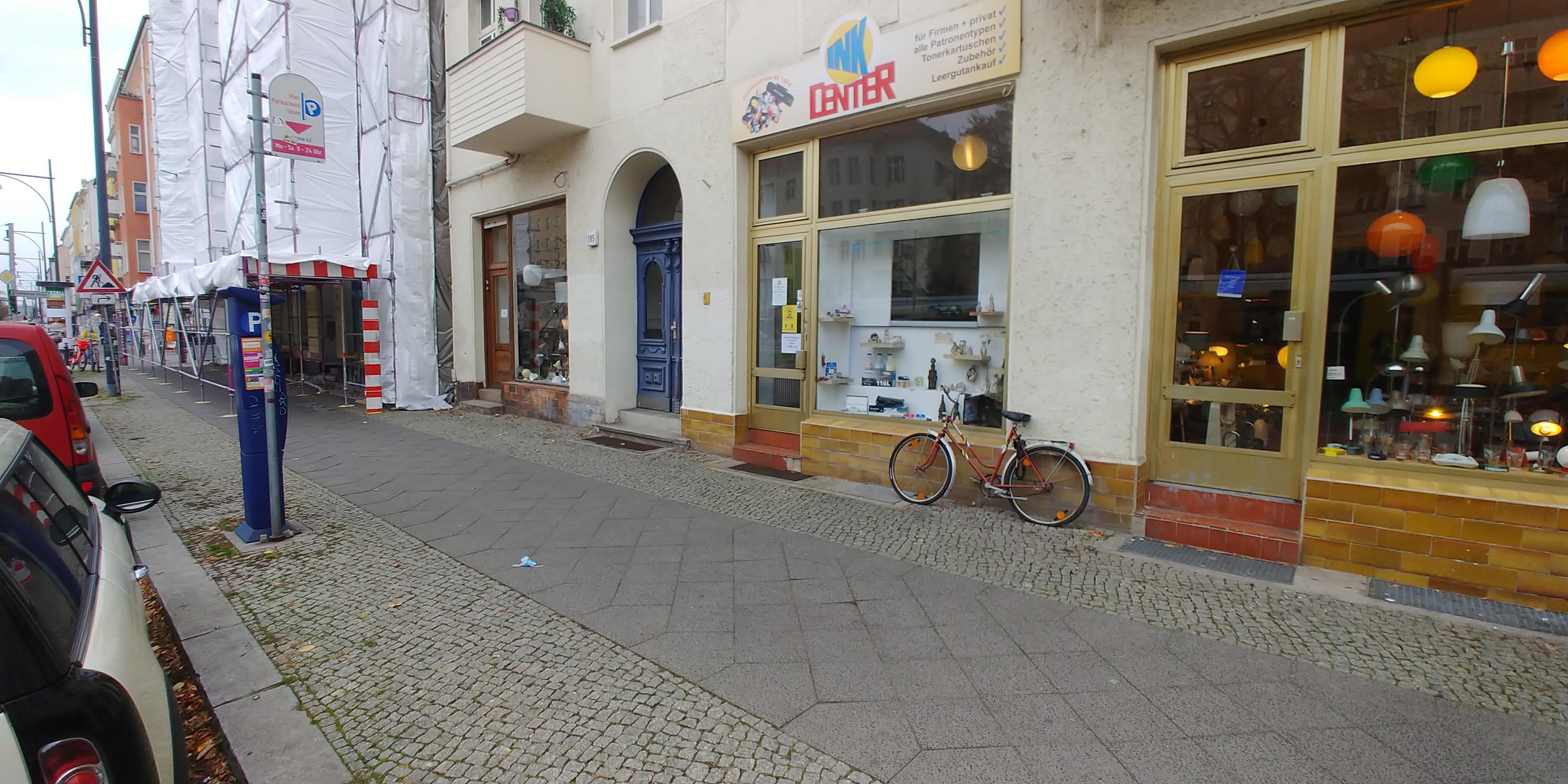 Um den Parkautomaten herum, zwischen den Laternen, sollten auch hier, jeweils vor und nach, drei bis vier Radbügel, längs zum Gehwegrand, positioniert werden, um den Bewohnern der Häuser als auch Gästen und KundInnen der Gewerbe entsprechende Radabstellanlagen, statt günstiger Kfz-Parkplätze für nur wenige, bieten zu können.