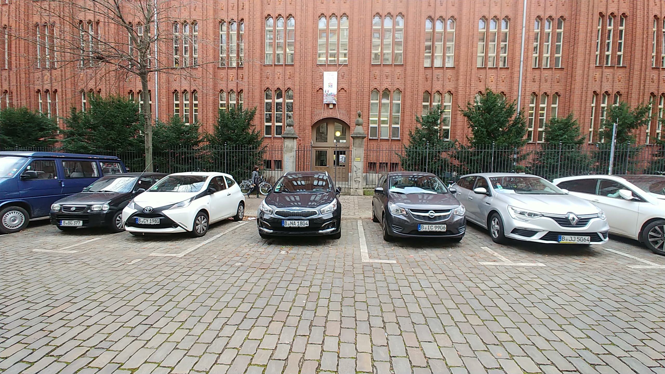 Alle drei vorderen Schuleingänge sollten mit Lastenrad- und Fahrradstellplätzen im jetzigen Parkraum besetzt werden und damit auch der direkte Zugang zur/von der Strasse und Blickbeziehungen zum/von in der Strasse fahrenden Kraftfahrzeugen vor zuparkenden Kfz und deren HalterInnen geschützt werden.