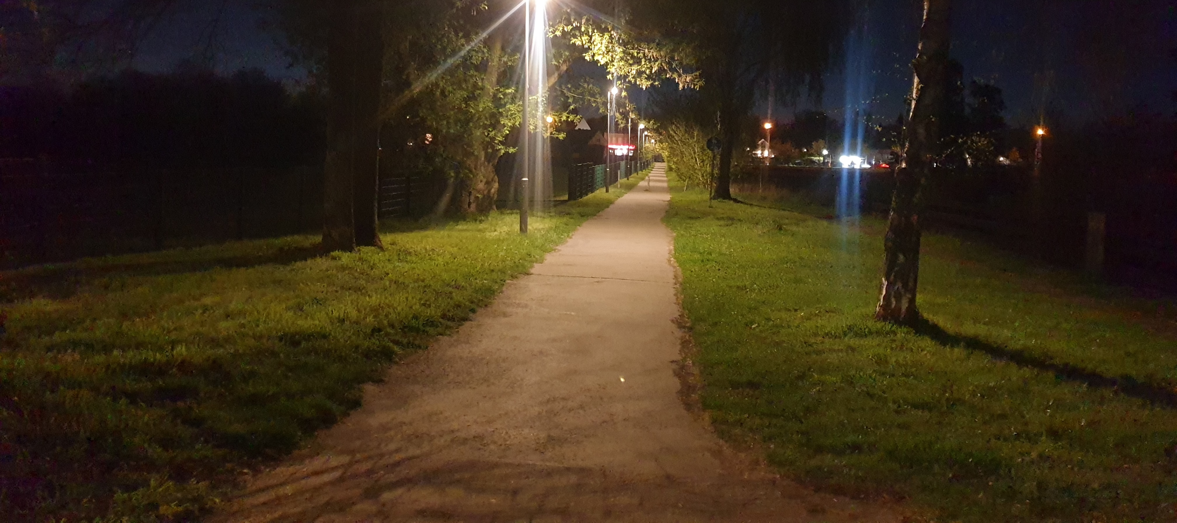 Umgebung der Position - Die angedachte Position ist an einem Fußweg, die Straße endet bereits davor. Es gibt mehrere Bäume und die direkte Sicht (einen Blick in die kleine Ferne) über das Feld. Der Bereich neben dem Weg ist breiter, so dass eine Bank den Weg der zu Fuß Gehenden und Radfahrenden nicht beeinträchtigt. Auch ist eine Laterne in direkter Nähe, so dass im Dunkeln der Bereich um die Bank hell beleuchtet ist (Lichtabschreckung gegen Vandalismus).