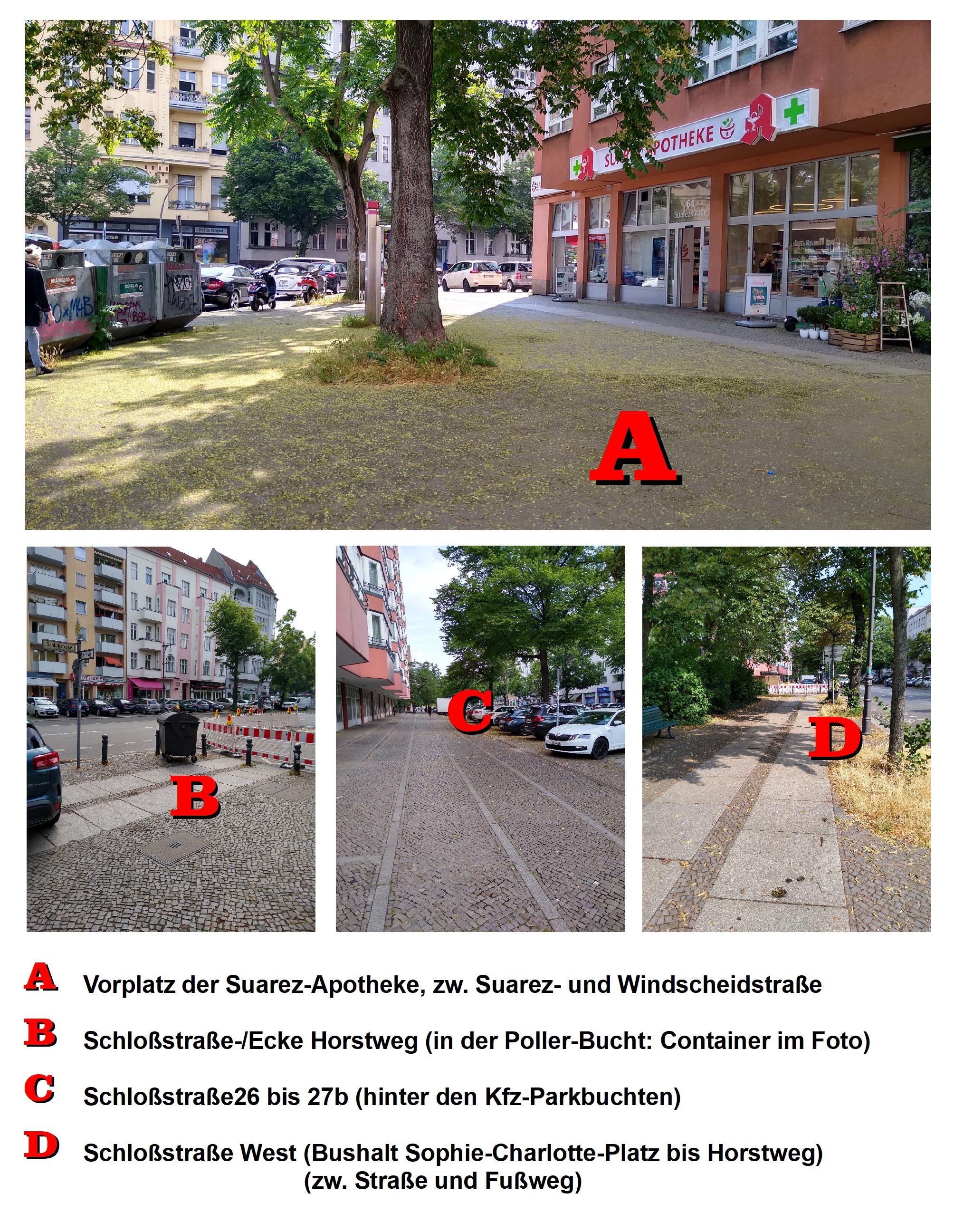 Rund um den Sophie-Charlotte-Platz gibt es mehrere geeignete Standorte: Foto A) Insbesondere der Apotheken-Vorplatz wäre DIREKTER Einzugsbereich von 5 Straßen aus 5 Richtungen: Suarez-, Windscheid-, Bismarckstraße, Kaiserdamm,Schloßstraße. Foto B) Der durch Poller geschützte Raum neben dem Dönerladen Schloßstr./Horstweg Foto C) Auf dem (überbreiten) Fußweg hinter den Auto-Parkplätzen Foto D) Zwischen der Bushaltestelle Sophie-Charl.-Platz und dem Horstweg (Schloßstraße West) würde eine Fahrradbox zwischen Fußweg und Fahrradstreifen weder Fußgängern noch Rad- oder Autofahrern Platz wegnehmen.