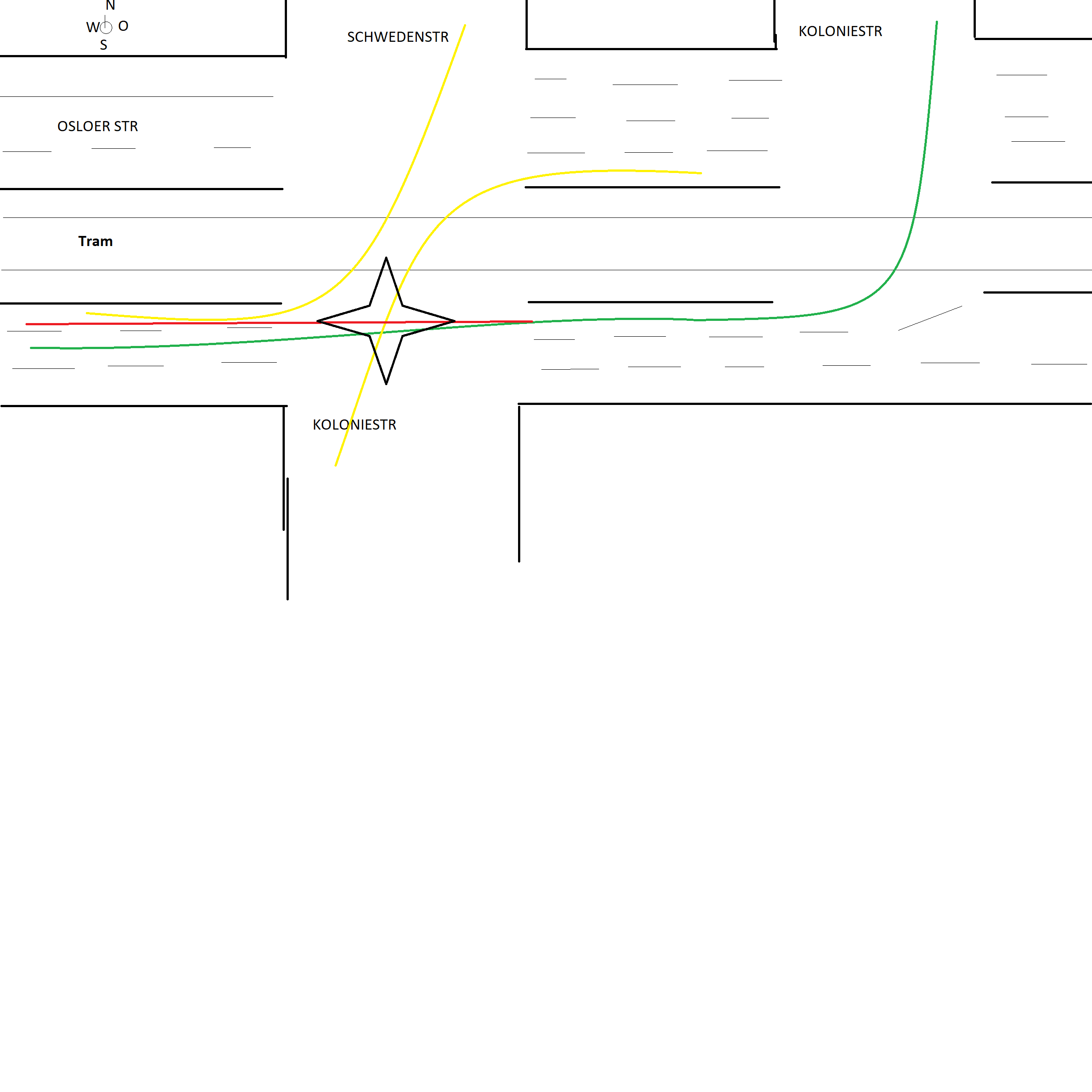Gleich zwei besondere Verkehrsführungssysteme sorgen an der Kreuzung Osloer Str und Kolonie-/Drontheimerstr. regelmäßig für Beinah-Zusammestöße von Fahrzeugen und führt zu dem dazugehörigen Gehupe. Erstens, erkennen nicht 100% der Fahrzeugfahrer*innen, dass hier voreinander Abgebogen werden soll. Was noch ok ist. Allerdings verstehen viele nicht wie sie von Westen nach Osten auf der Osloer fahrend, in die nördliche Koloniestrasse abbiegen können. Sie ordnen sich zu früh in die Linksabbiegerspur (Richtung Schwedenstr) ein, und fahren dann aber gerade aus in den entgegengesetzen Linksverkehr hinein. In de Zeichnung mit rot gezeichnet. Grün wäre die richtige Fahrweise zum Abbiegen in die Koloniestr. Gelb die eigentliche Fahrspur auf der Linksabbiegerspur