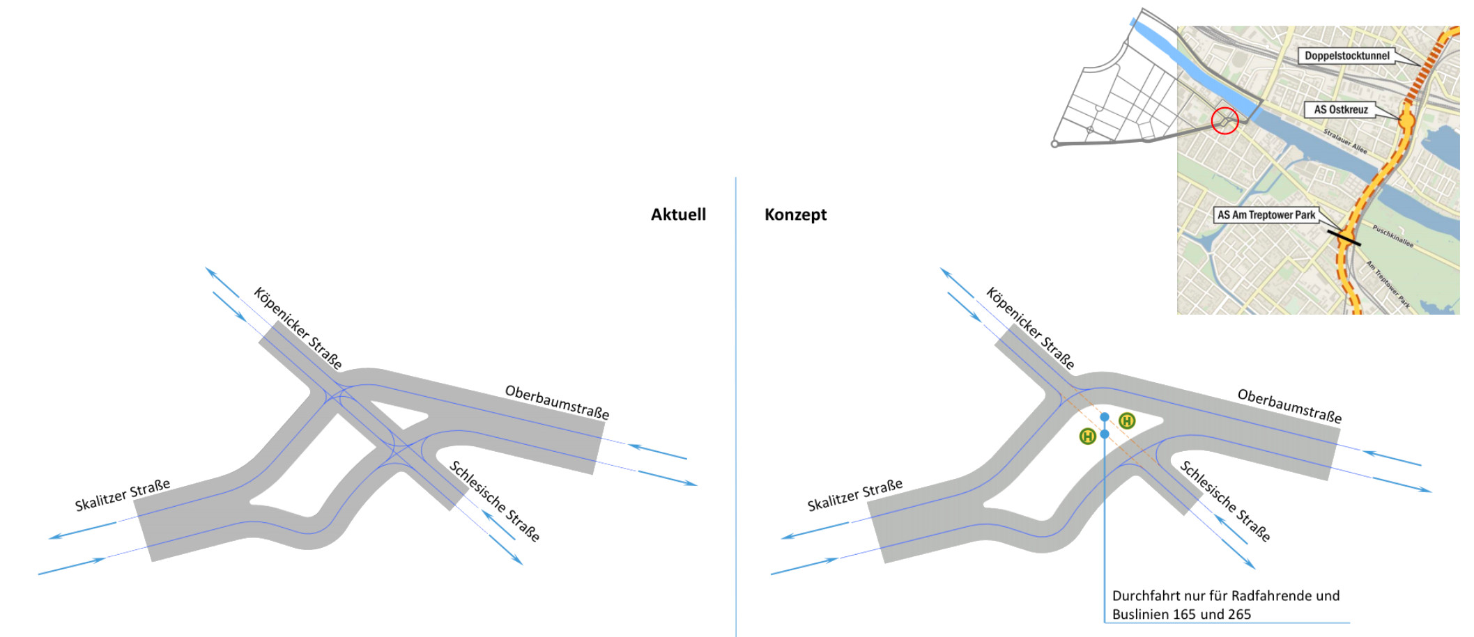Idee: Sobald die Elsenbrücke wieder ihre volle Kapazität erlangt, kann das "Verkehrskreuz" am Schlesischen Tor aufgelöst werden, um den Durchgangs- und Pendelverkehr über das Gebiet am Schlesischen Tor zu unterbinden. Diese Maßnahme würde zu einer Reduzierung des Verkehrsaufkommens und somit zur Erhöhung der Lebensqualitüt und Verkehrssicherheit für die Anwohnenenden führen.