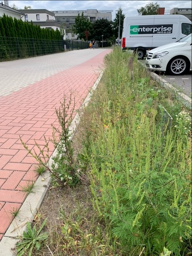 Nachdem ich heute eine Pflanze ein Stück entfernt von der gemeldeten „Plantage“ selber entfernen wollte, sah ich allerdings auf dem gesamten Grünstreifen am Parkplatz ähnlich viele Ambrosía, nur gut verteilt.