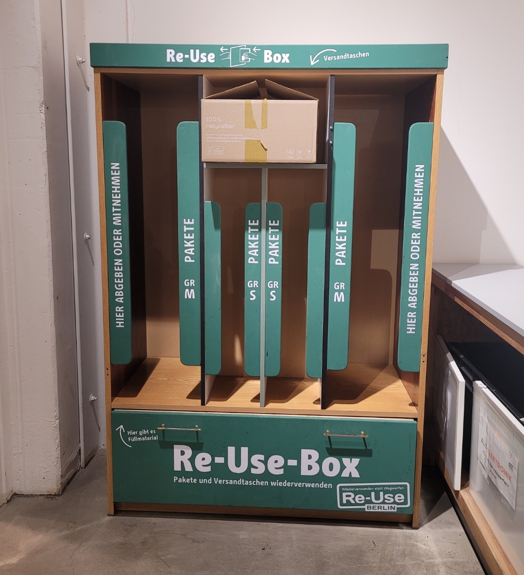 In einigen Berliner Einrichtungen (wie im Foto in der Nochmall) gibt es schon Re-Use Stationen wie z.B. diese hier in der Personen ihre genutzten Pakete mitbringen können sodass andere sie wieder benutzen können. Diese Art der Wiederverwendung und Verfügbarmachung für die Allgemeinheit von Verpackungsmaterial und anderem ist nicht nur nachhaltig, sondern auch gut für alle Personen, die finanziell weniger gut aufgestellt sind. Ich wünsche mir viel mehr solcher Angebote in der Stadt. In Bibliotheken, in den Hausfluren der Landeseigenen Wohnungsgesellschaften wie der WBM, in Bezirksämtern und und und.